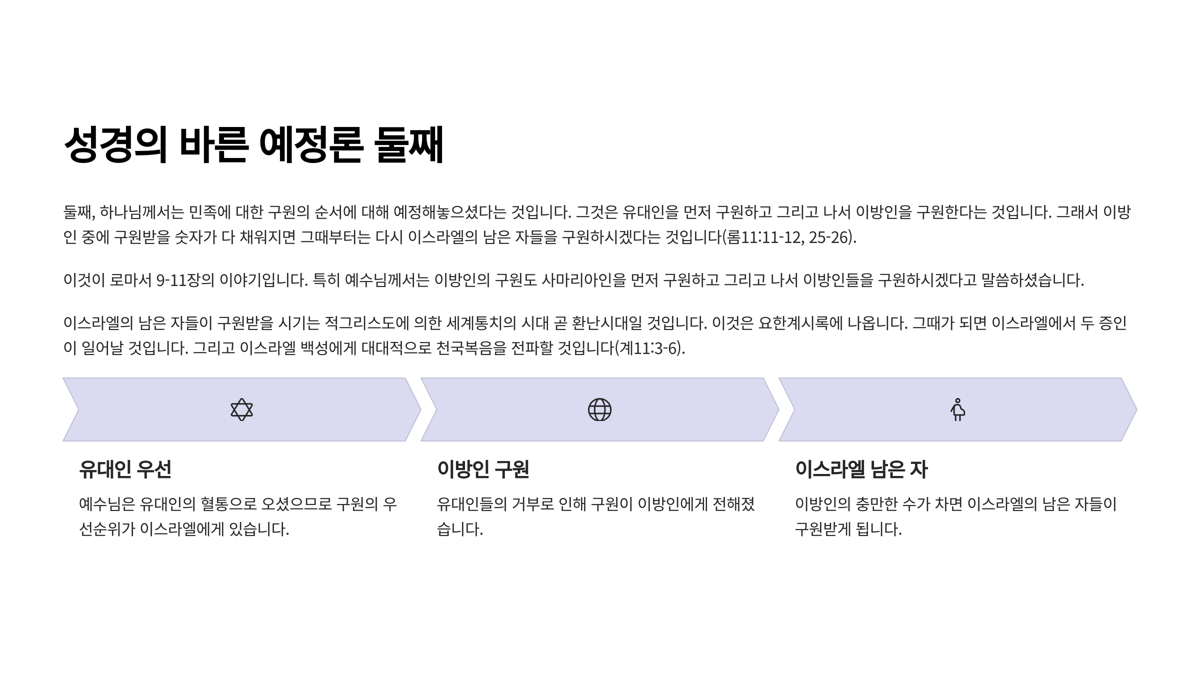 둘째, 민족에 대한 구원의 순서에 대해 예정해놓으셨다는 것이다. 그것은 유대인을 먼저 구원하고 그리고 나서 이방인을 구원한다는 것이다. 그래서 이방인 중에 구원받을 숫자가 다 채워지면 그때부터는 다시 이스라엘의 남은 자들을 구원하시겠다는 것이다(롬11:11~12, 25~26). 이것이 로마서 9~11장의 이야기이다. 특히 예수님께서는 이방인의 구원도 사마리아인을 먼저 구원하고 그리고 나서 이방인들을 구원하시겠다고 말씀하셨다.