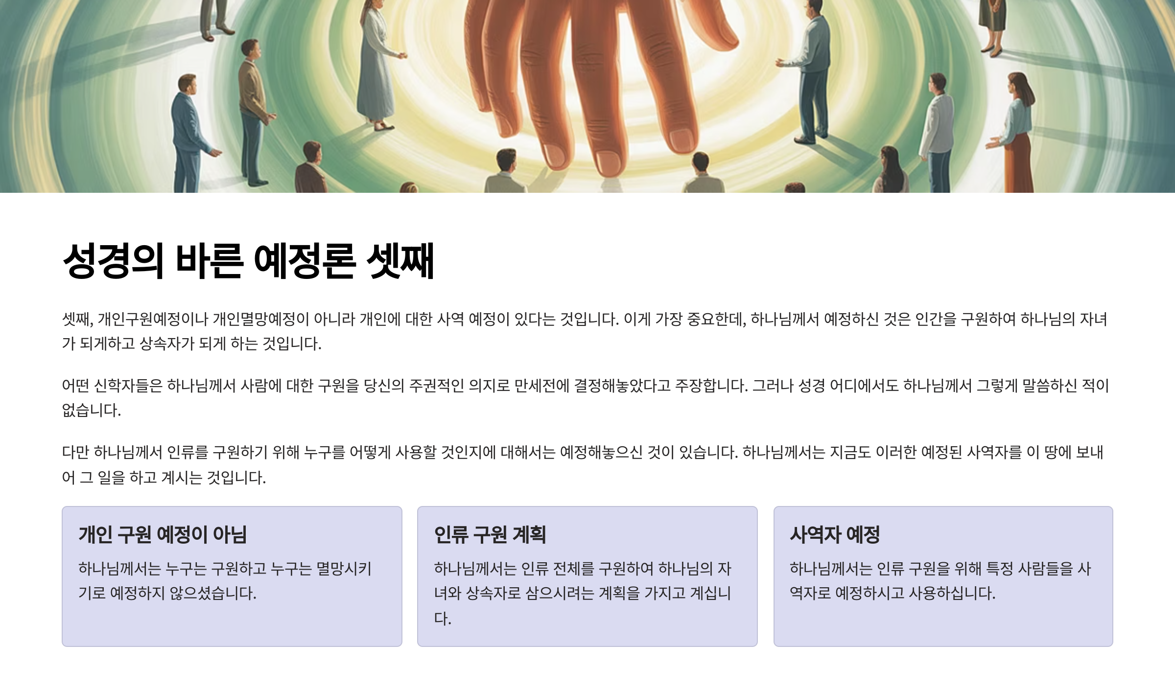 셋째, 개인구원예정이나 개인멸망예정이 아니라 개인에 대한 사역 예정이 있다는 것이다. 이게 가장 중요한데, 하나님께서는 예정하신 것은 인간을 구원하여 하나님의 자녀가 되게하고 상속자가 되게 하는 것이다. 그런데 어떤 신학자들은 이러한 사실을 말하지 않고, 하나님께서 사람에 대한 구원을 당신의 주권적인 의지로 만세전에 결정해놓았다는 주장한다. 그러나 성경 어디에서 하나님께서 그렇게 말씀하신 적이 없다. 다만 하나님께서 인류를 구원하기 위해 누구를 어떻게 사용할 것인지에 대해서는 예정해놓으신 것이 있다. 하나님께서는 지금도 이러한 예정된 사역자를 이 땅에 보내어 그 일을 하고 계시는 것이다.