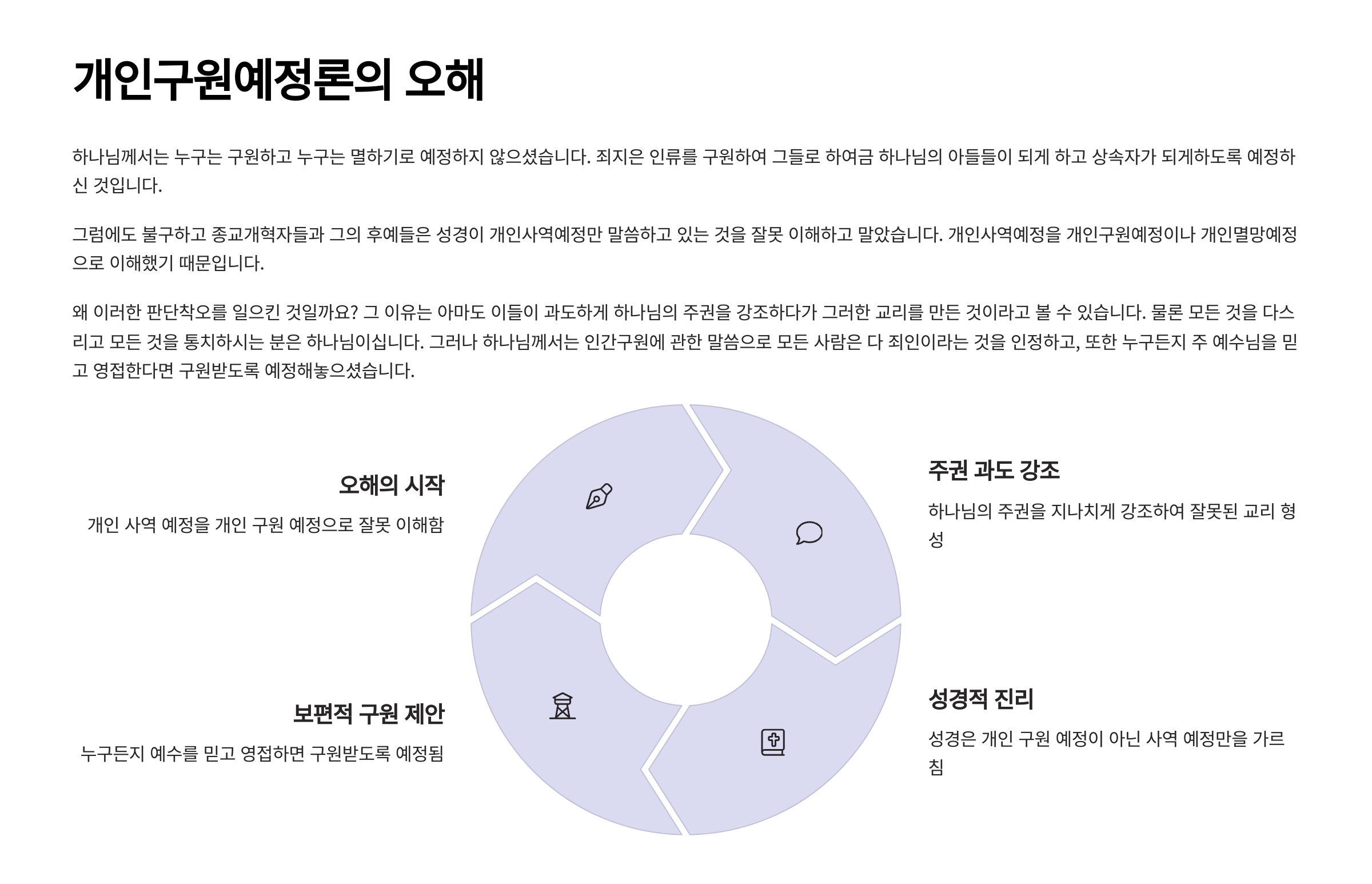 그럼에도 불구하고 종교개혁자들과 그의 후예들은 성경이 개인사역예정만 말씀하고 있는 것을 잘못 이해하고 말았다. 개인사역예정을 개인구원예정이나 개인멸망예정으로 이해했기 때문이다. 그럼, 왜 이러한 판단착오를 일으킨 것일까? 그 이유는 아마도 이들이 과도하여 하나님의 주권을 강조하다가 그러한 교리를 만든 것이라고 본다. 물론 모든 것을 다스리고 모든 것을 통치하시는 분은 하나님이시다. 그러나 하나님께서는 인간구원에 관한 말씀으로 모든 사람은 다 죄인이라는 것을 인정하고, 또한 누구든지 주 예수님을 믿고 영접한다면 구원받도록 예정해놓으셨다.는 사실을 확실히 더 개닫게 되었다.