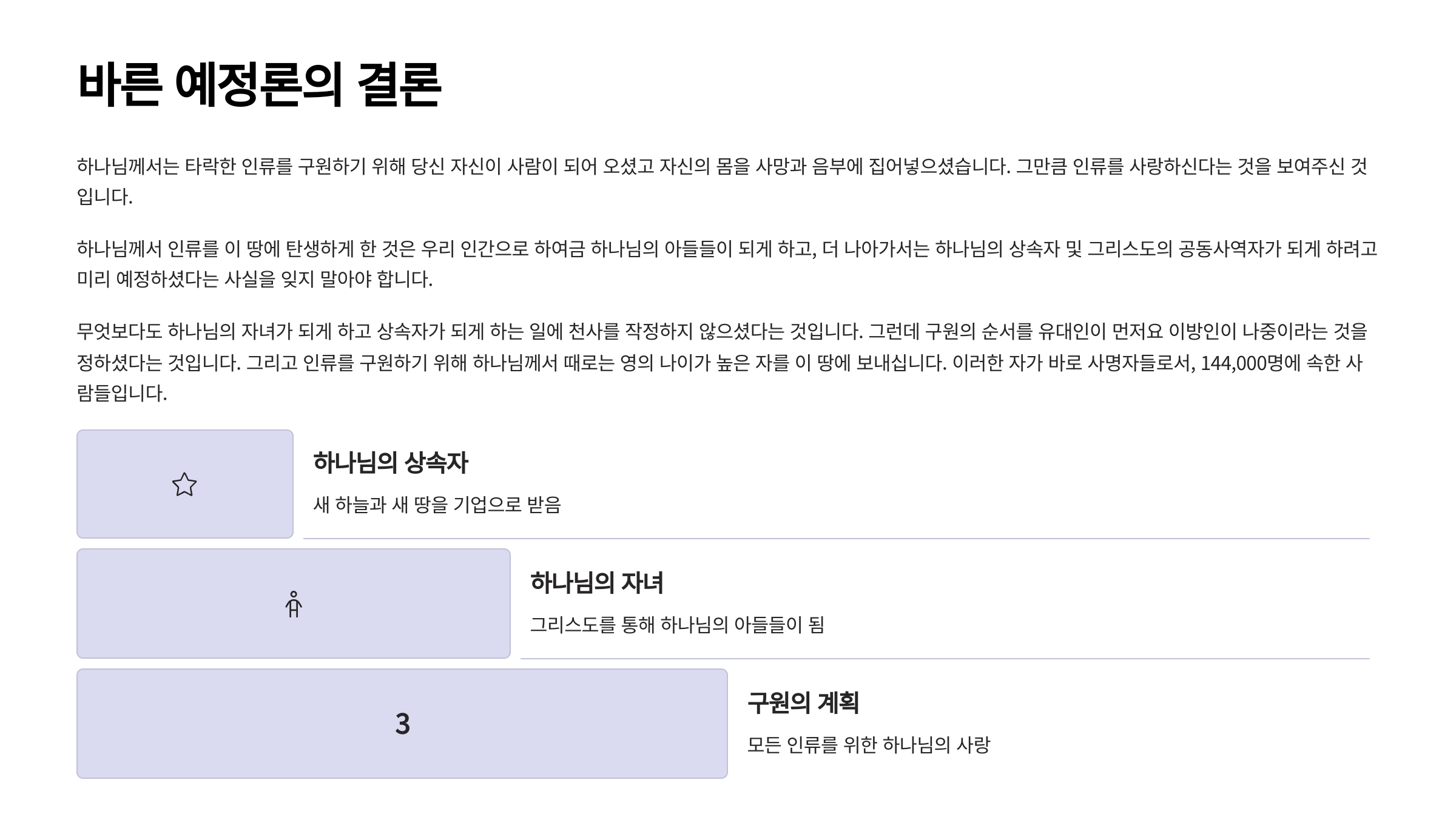 그렇다면 성경이 말씀하고 있는 바 진정한 바른 예정론이란 어떤 것인가? 그것은 약 3가지로 요약될 수 있다.
