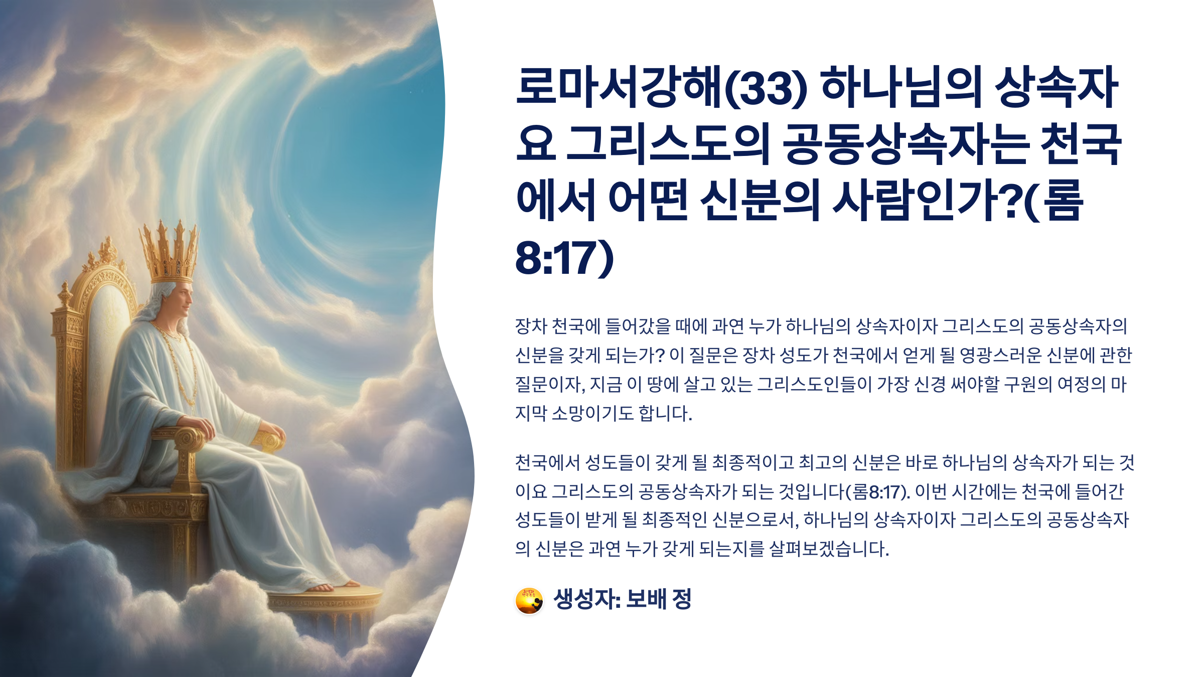 제목: [로마서강해(33)] 하나님의 상속자요 그리스도의 공동상속자는 천국에서 어떤 신분의 사람인가?(롬8:17)_동탄명성교회 정보배목사