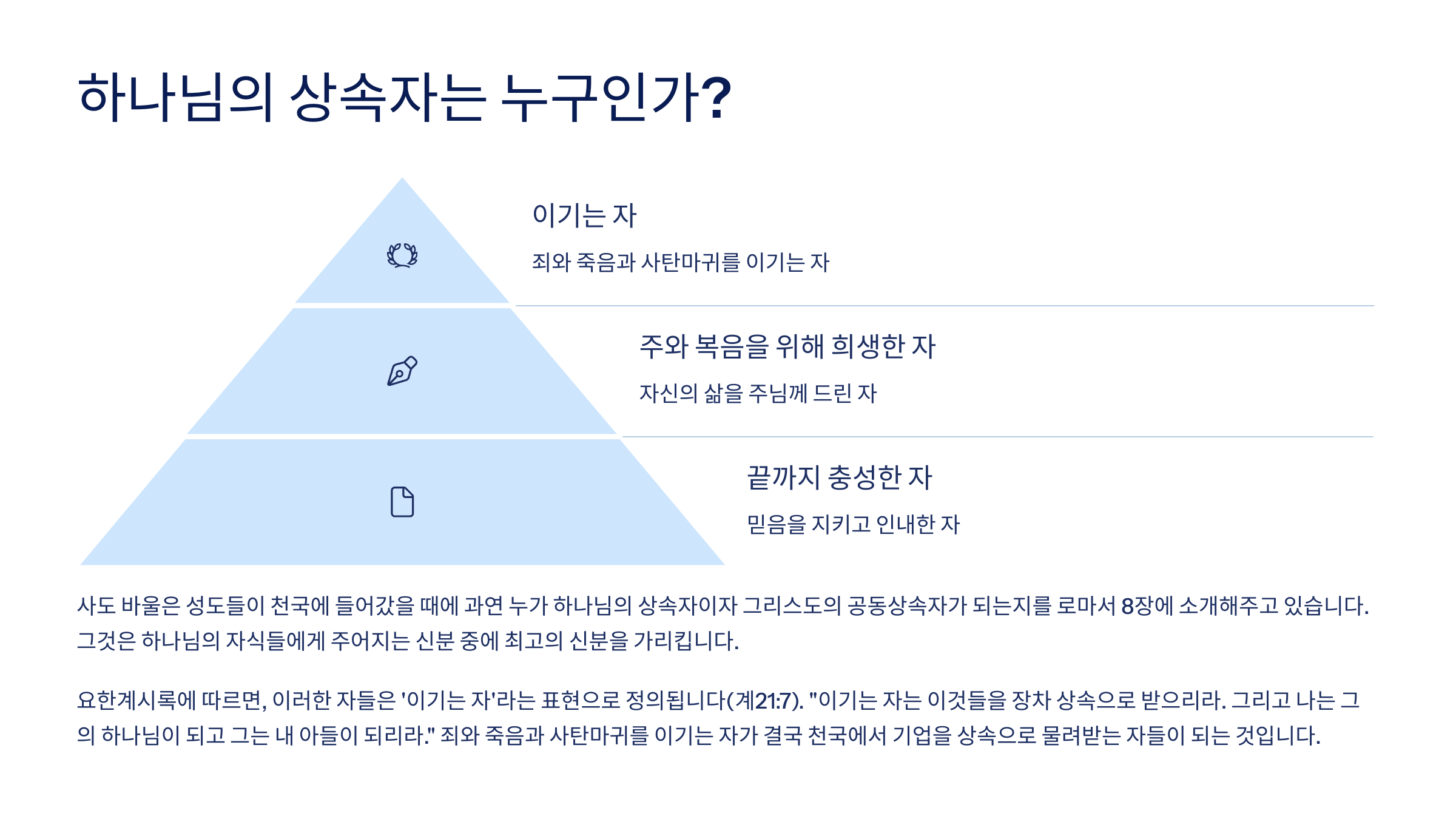 사도 바울은 성도들이 천국에 들어갔을 때에 과연 누가 하나님의 상속자이자 그리스도의 공동상속자가 되는지를 로마서 8장에 소개해주고 있다. 그것은 하나님의 자식들에게 주어지는 신분 중에 최고의 신분을 가리킨다. 그것은 '하나님의 상속자들'이자 '그리스도의 공동상속자들'이다. 이는 곧 천국에 들어갔을 때에 하나님의 유업을 상속으로 받게 될 자들을 가리킨다. 이때 상속자가 받게 될 것은 하늘에 준비된 하나님의 기업(클레로노미아)으로서, 이것은 썩지 않으며 더럽혀지지도 않고, 쇠약해지지도 않는 기업이라고 사도 베드로가 말했다(벧전1:4). 왜냐하면 이것은 하나님이 계시는 하늘에 보존된 채 있는 영원한 기업이기 때문이다. 그렇다. 천국에 들어간 성도들 중에는 이러한 하늘의 기업을 물려받을 자들이 있고 앞으로도 조금은 더 있을 것이다. 그런데 요한계시록에 따르면, 이러한 자들은 한 마디로 정의하는 용어가 딱 등장하는데, 그것은 바로 '이기는 자'라는 표현이다(계21:7). 죄와 죽음과 사탄마귀를 이기는 자가 결국 천국에서 기업을 상속으로 물려받는 자들이 되는 것이다.