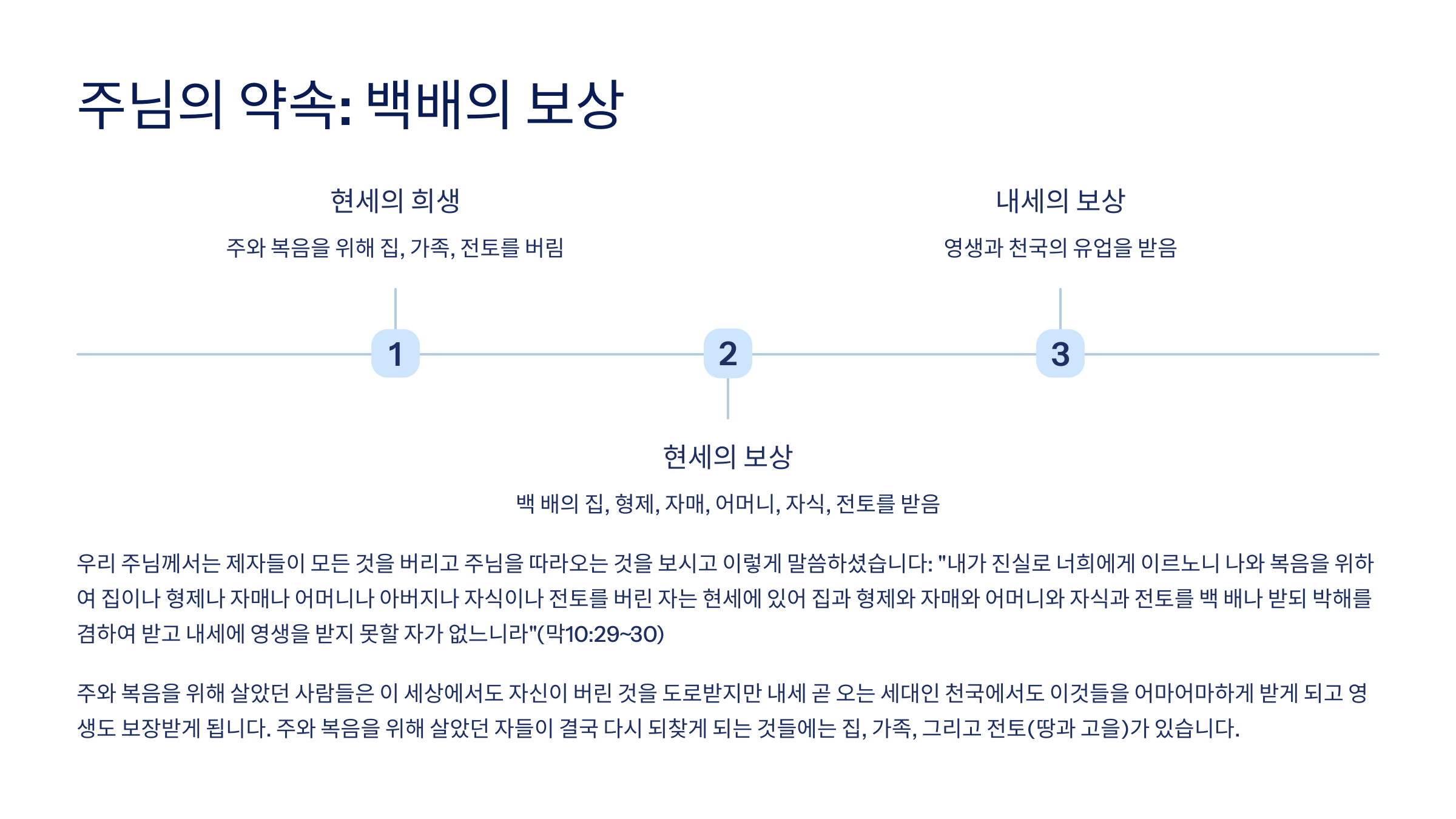 막10:29~30 예수께서 이르시되 내가 진실로 너희에게 이르노니 나와 복음을 위하여 집이나 형제나 자매나 어머니나 아버지나 자식이나 전토를 버린 자는 30 현세에 있어 집과 형제와 자매와 어머니와 자식과 전토를 백 배나 받되 박해를 겸하여 받고 내세에 영생을 받지 못할 자가 없느니라