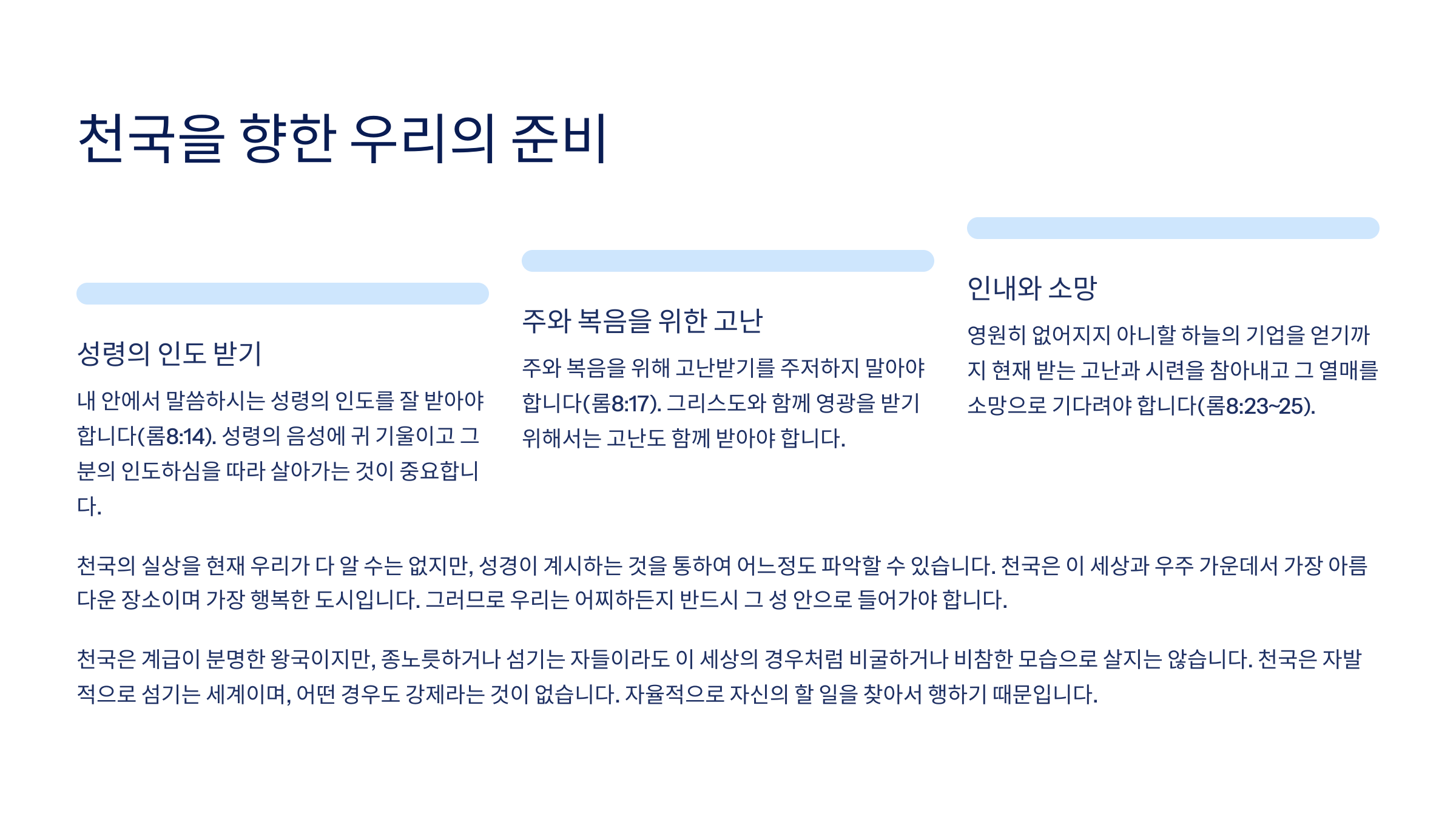 천국의 실상을 현재 우리가 다 알 수는 없다. 다만 성경이 계시하는 것을 통하여 어느정도 파악하며 천국에 들아거 확인한 것만 알 수 있는 수준이다. 그러나 성경에 계시되어 있는 것만 보더라도 천국은 정말 놀라운 세계가 아닐 수가 없다. 특히 천국은 계급이 분명한 왕국이라는 사실이다. 저 천국에서 만왕의 왕이자 만주의 주는 오직 한 분으로서 우리 주 예수님 뿐이시다(계17:14). 그렇지만 그분은 주와 복음을 위해 희생한 자들에게 왕권을 나눠주신다. 그래서 천국에 가보면, 그리스도와 더불어 주인노릇할 자도 있고 왕노릇할 자도 있다. 이들이 바로 144,000명의 주의 종들로서, 이들에게는 전부다 자기 집에 그들이 부리는 천사들이 있고 그들을 섬기러 오는 성도들도 가지고 있다. 그리고 144,000명의 주의 종들 중에 상윗 부분에 해당하는 사람들은 성밖으로 나가서 성밖으로 고을들 위에서 왕노릇하기도 한다. 그리고 이렇게 왕노릇하는 자들의 대표가 바로 24장로들인 것이다. 아마도 24장로들은 은하계의 별들까지도 다스리는 것 같다. 그러나 이와 반대의 경우도 있다. 천국에 들어간 성도들 중에는 종노릇할 자도 있고 섬기는 자도 있는 것이다(마20:26~27). 그렇지만 천국에서 종노릇하거나 섬기는 자들이라도 그들은 이 세상의 경우처럼 비굴하거나 비참한 모습으로 살지는 않는다. 왜냐하면 천국은 자발적으로 섬기는 세계이기 때문이다. 여기서는 어떤 경우도 강제라는 것이 없다. 자율적으로 자신의 할 일을 찾아서 행하기 때문이다. 그러므로 천국은 이 세상과 우주 가운데서 가장 아름다운 장소이며 가장 행복한 도시인 것이다. 그러므로 우리는 어찌하든지 반드시 그 성 안으로 들어가야 한다. 그리고 그때를 위해 우리의 마지막 남은 때를 활용해야 한다. 이를 위해서는 3가지가 중요하다. 첫째로 내 안에서 말씀하시는 성령의 인도를 잘 받아야 한다(롬8:14). 그리고 둘째는 주와 복음을 위해 고난받기를 주저하지 말아야 한다(롬8;17). 그리고 마지막으로 셋째는, 영원히 없어지지 아니할 하늘의 기업을 얻기까지 현재 받는 고난과 시련을 참아내고 그 열매를 소망으로 기다려야 한다(롬8:23~25).