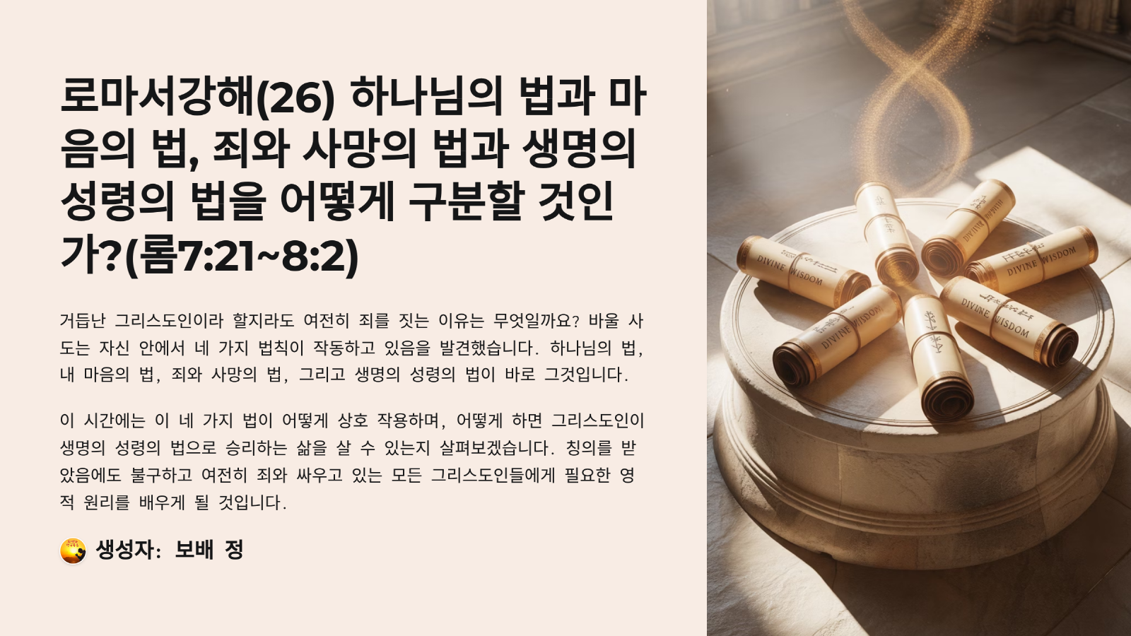 제목: [로마서강해(26)] 하나님의 법과 마음의 법, 죄와 사망의 법과 생명의 성령의 법을 어떻게 구분할 것인가?(롬7:21~8:2)_2025-05-29(목)