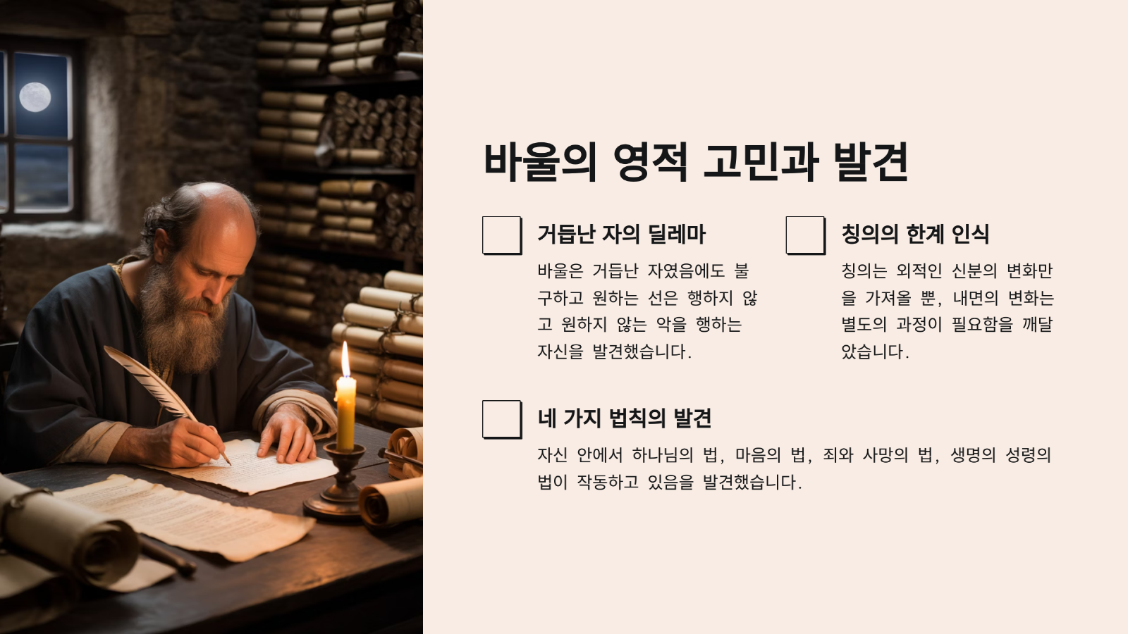 바울은 거듭난 자였다. 그런데 고민이 있었다. 거듭난 자였음에도 불구하고 자신이 원하는 선은 행하지 아니하고 원하지 않는 악을 행하는 것을 발견하게 된 것이다. 그래서 바울은 칭의를 얻어 구원을 얻은 자가 되었음에도 불구하고 자신이 여전히 달라지지 못한 삶을 살고 있는지를 검토하게 된다. 그리하여 자기 안에서 4개의 법칙들이 돌아가고 있다는 것을 발견하게 된다. 그것은 바로 '하나님의 법', '내 마음의 법',  '죄와 사망의 법', '생명의 성령의 법'이 돌아가고 있었던 것이다. 그래서 바울은 이것들이 상호 어떤 관련을 맺으며 돌아가는지를 정리한다. 그래서 이것들이 모두가 다 항상 동일한 값을 나타낸다고는 것을 착안하고는 이 네 가지 법을 정리한 후에, 거듭난 그리스도인이 어떻게 해야 죄를 짓지 아니하고 죄된 본성에서 해방되며 자신의 지체를 의의 병기로 하나님께 드릴 수 있는지를 설명한다. 그것은 사람이 4가지 법들 중에 최고 상위의 법이 자신을 지배할 수 있도록 해야 한다는 것이다. 그래서 이 시간에는 어떻게 할 때 과연 거듭난 그리스도인이 생명의 성령의 법으로 승리하는 삶을 살 수 있는지, 4가지 법을 살펴보고 이것을 정리해보고자 한다.
