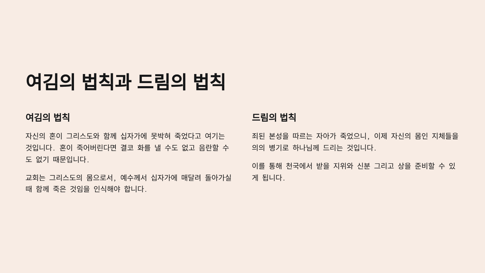 그래서 바울은 내적인 성분의 변화를 위해 필요한 2가지 법칙을 제안하였다. 하나는 여김의 법칙이다. 내가 칭의를 받았으나 아직 내면의 변화는 겪지 않았으니, 자신의 내면에 속한 영역의 하나인 혼이 십자가에 못박혀 죽은 채 있다고 여겨야 한다는 것이다. 그래서 혼이 육체 속에 들어있는 죄된 본성을 따라가지 않게 되기 때문이다. 혼이 죽어버린다면 결코 화를 낼 수도 없고 음란할 수도 없기 때문이다. 그래서 살펴보니, 교회는 그리스도의 몸으로서, 예수께서 십자가에 매달려 돌아가실 때에 몸도 함께 죽은 것임을 발견하게 된다. 그러므로 모든 그리스도인들은 거듭난 이후 자아 곧 자기의 혼이 그리스도와 함께 십자가에 못박혀 죽었다고 여길 때에 비로소 자아가 죽음에 넘겨지게 되어 더 이상 죄된 본성을 따라가지 않는 것이다.