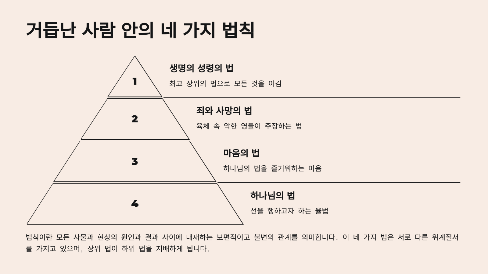 그렇다면 거듭난 사람 안에서 돌아가고 있는 4가지 법칙은 무엇인가? 여기서 '법칙'이라 함은 모든 사물과 현상의 원인과 결과 사이에 내재하고 있는 보편적이고 연적인 불변의 관계를 가리키는 것으로서 항상 답이 일정한 것을 가리킨다. 그러므로 여기서 법칙이라는 뜻은 사람이 거듭난 그리스도인이 되었음에도 불구하고 항상 살아보면 그렇게 결론이 남을 지칭하는 것이다.