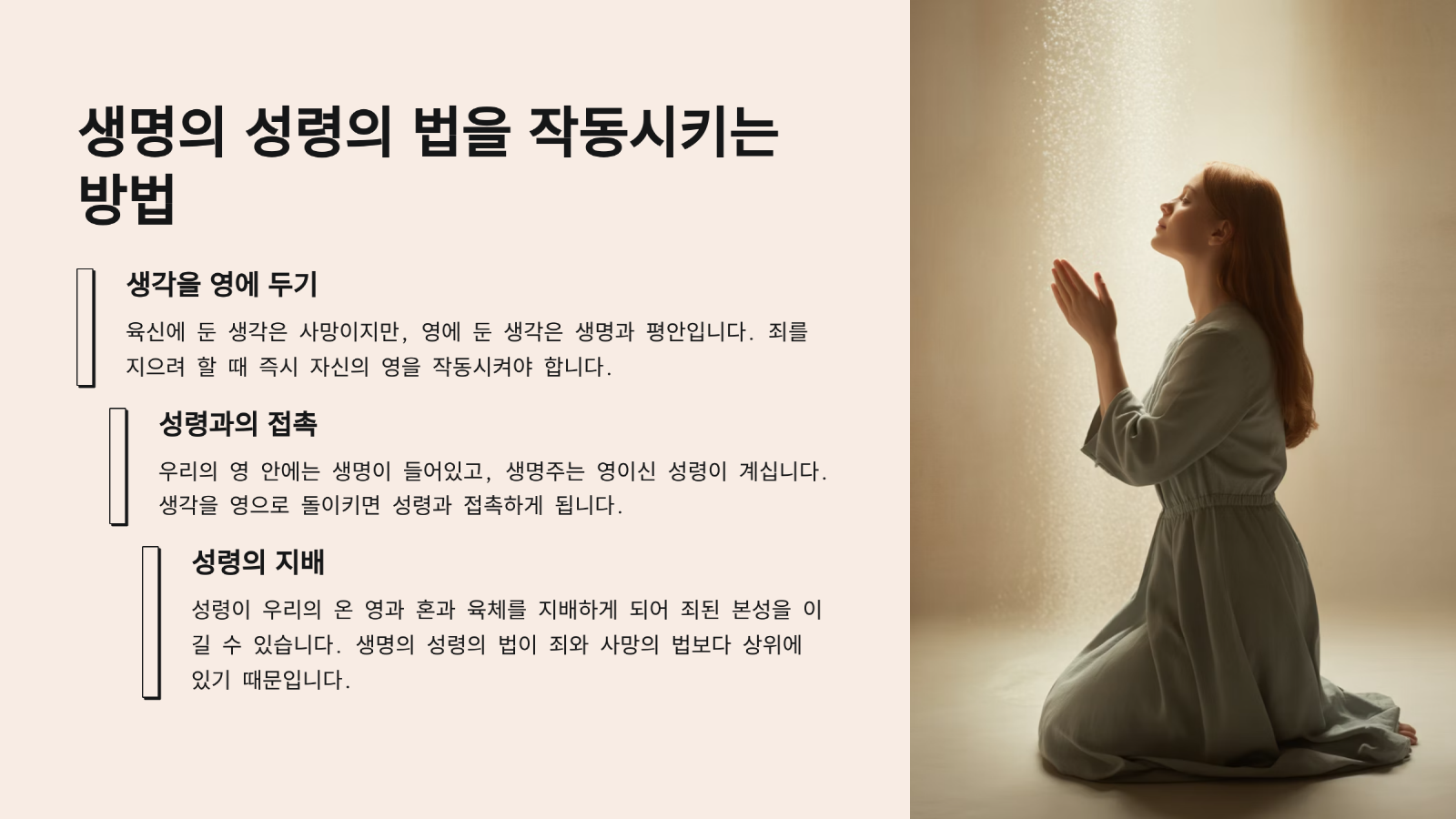 그렇다면 그리스도인들은 어떻게 해야 자기 안에 있는 죄된 본성을 이길 수 있는가? 그래서 죄와 사망의 법에서 벗어날 수 있을까? 그러한 방법들로는 여러가지가 있을 수 있으나, 가장 좋은 방법은 죄와 사망의 법이 작동될 때마다 생명의 성령의 법을 작동시키는 것이다. 그것은  바로 자신의 생각을 육체에 두는 것이 아니라 영에 두는 것이다(롬8:6). 왜냐하면 육신에 둔 생각은 사망이지만, 영에 둔 생각은 생명과 평안이기 때문이다. 그러므로 사람이 죄를 지으려고 할 때에는 즉시 자신의 영을 작동시켜야 한다. 왜냐하면 자신의 영 안에는 생명이 들어있고, 또한 생명주는 영이신 성령이 들어있기 때문이다. 그러므로 내 생각을 영으로 돌이키게 되면 즉시 우리는 우리의 영 안에 계시는 성령과 접촉하게 된다. 그러면 성령이 우리의 온 영과 혼과 육체를 지배하게 되는 것이다. 그러므로 죄된 본성을 이길 수가 있는 것이다. 왜냐하면 성령의 성령의 법이 죄와 사망의 법보다 한 수 위이기 때문이다. 이 두 법이 서로 충돌하게 되면, 항상 생명의 성령의 법이 이기게 되는 것이다. 그러므로 우리 그리스도인들이 또 다시 죄를 범하려고 할 때 그래서 죄된 본성이 자신을 주장하려고 할 때에는 즉시 우리는 우리의 생각을 영에 두어, 생명의 성령의 법을 작동시켜야 하는 것이다.