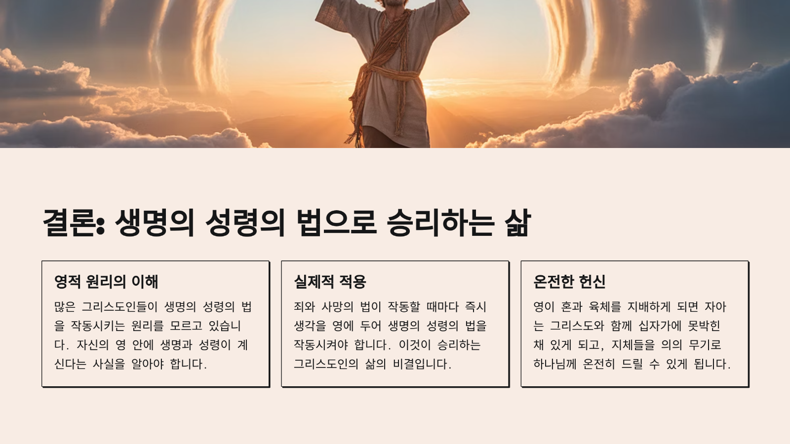 그러므로 사도 바울은 이러한 죄의 법을 이기려면 더 강력한 상위 법이 있어야 한다고 말한다. 그런데 그러한 법이 있는 것이다. 그것은 바로 '생명의 성령의 법'이다. 왜냐하면 생명의 성령께서 사람 속에 들어있는 죄와 사망을 이기기 때문이다. 이것의 예표가 바로 죽음을 깨치고 부활하신 예수님이다. 부활생명이 사망을 항상 이기기 때문이다.