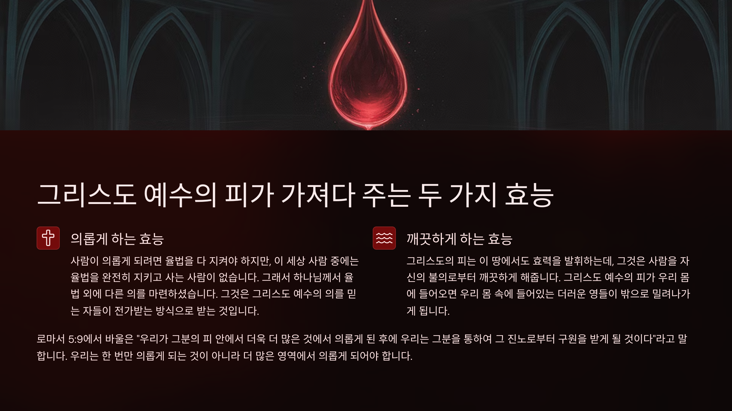 그러므로 사도 바울은 로마서 5:9의 말씀에서 그리스도의 피에 대한 효능을 2가지로 이렇게 말했다.