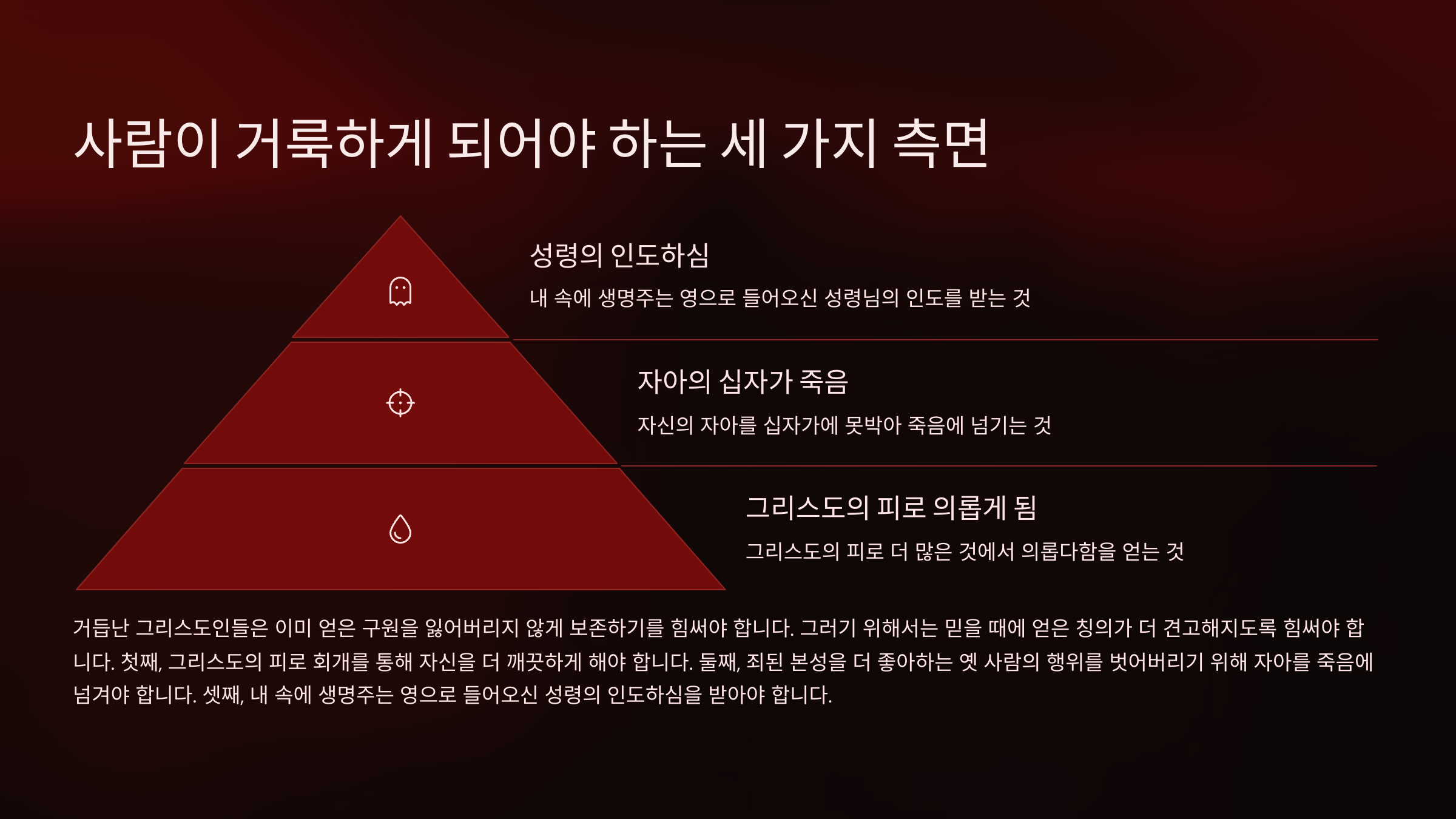 셋째는 내 속에 생명주는 영으로 들어오신 성령의 인도하심을 받는 것이 필요하다(롬8:14~16). 이전에는 자신의 육체 속에 살고 있던 죄된 본성을 따라갔지만 이제는 내 속에 생명주는 영으로 들어오신 성령님의 인도를 받는 것이다. 그래서 더이상 죄를 짓지 않고 의로운 삶을 살게 되기 때문이다.
