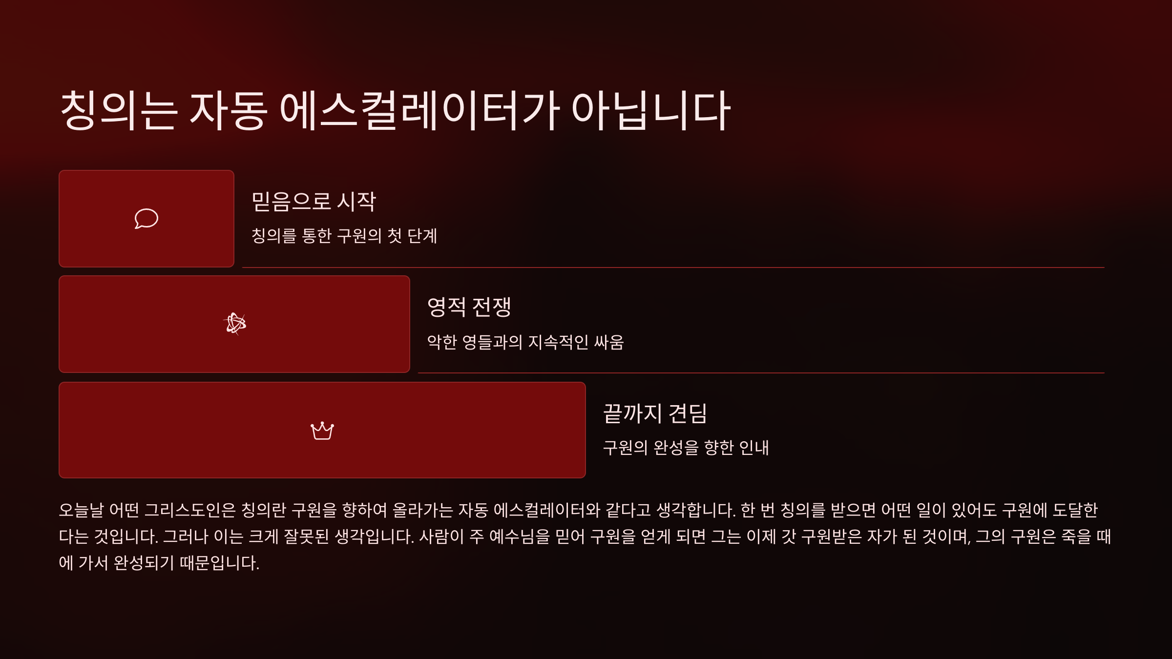 오늘날에 들어와서 어떤 그리스도인은 칭의란 구원을 향하여 올라가는 자동 에스컬레이터와 같다고 생각하고 있다. 한 번 칭의를 받으면 곧 자신은 어떤 일이 있어서 구원에 도달한다는 것이다. 왜냐하면 자신이 예수님을 믿게 된 것은 만세전에 자신을 구원하시려는 하나님의 예정을 따라서 믿게 된 것이기 때문에 자신의 구원에 있어서는 아무런 문제가 없다고 보는 것이다. 하나님이 잘못되지 않는 한 자신의 구원은 변함이 없다고 믿는 것이다. 그러나 그것은 크게 잘못된 생각이다. 왜냐하면 사람이 자신이 죄인인 것을 시인하고 주 예수님을 믿어서 구원을 얻게 되면 그는 이제 갓 구원받은 자가 된 것이다. 그리고 그의 구원은 죽을 때에 가서 완성되기 때문이다. 그런데 그날이 되기까지 악한 영들은 결코 우리를 가만 두고 보지 않을 것이다. 왜냐하면 악한 영들은 지금도 자기들은 이제 영영토록 천국에 들어가지 못 들어가게 되었다는 것을 알아차린 상태이기에, 하나님에 대한 미움을 인간에게 퍼부으려고 한다. 그래서 어찌하든지 이미 구원받은 성도라고 죄짓게 만들어 새 예루살렘 성 안으로 들어가지 못하도록 막고 있는 것이다. 그러므로 누군가 칭의를 얻었다고 할지라도 그 사람이 반드시 구원받는다고 정의할 수는 없다. 칭의를 얻은 시점에서 새 예루살렘 성 안으로 들어가는 순간까지 숱한 난관이 그를 기다리고 있기 때문이다. 그것을 극복하고 또한 지은 죄를 회개하고 또 성령의 인도를 따라갈 때에 비로소 완성되기 때문이다. 그러므로 칭의는 구원을 향하여 올라가는 자동 에스컬레이터와 같다고 결코 말할 수 없다.