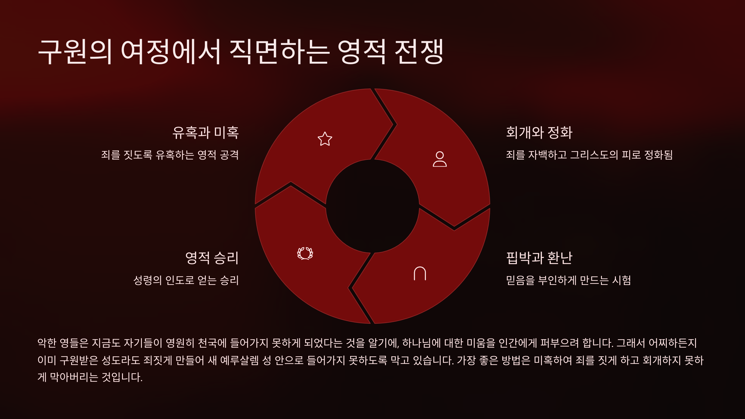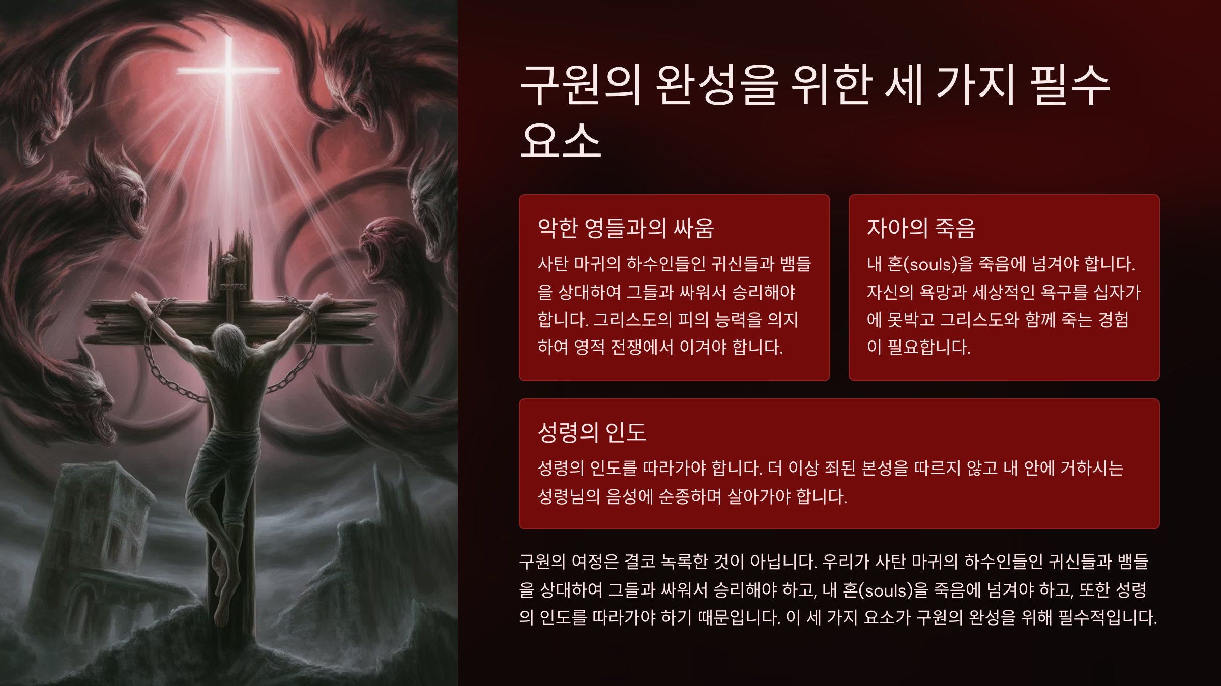 죄인이 구원받아 천국에 들어갈 때까지 사람은 많은 여정을 통과해야 한다. 그런데 죄인이 구원받는 시점부터 그 사람을 가만 두지 않으려는 세력이 있다. 그들은 바로 귀신들이자 뱀들이다. 이들은 죄인이 구원받은 시점부터 그를 구원에서 탈락시키고자 갖은 방법을 동원한다. 가장 좋은 방법은 미혹하여 죄를 짓게 하고 그리고 회개하지 못하게 막아버리는 것이다. 그리고 또 한 가지 방법은 핍박과 환난을 통하여 그리스도를 믿는 믿음을 부인하게 만든다. 그러므로 구원의 여정이 그리 녹록한 것이 아니다. 우리가 사탄 마귀의 하수인들인 귀신들과 뱀들을 상대하여 그들과 싸워서 승리해야 하고, 내 혼(souls)을 죽음에 넘겨야 하고, 또한 성령의 인도를 따라가야 하기 때문이다. 그러므로 내가 한 번 믿어서 칭의를 얻었다고 해서 내 구원이 완성된 것처럼 착각하지 말아야 한다. 내가 지금 칭의를 얻었다면 구원의 여정에 발을 들여놓은 것이기 때문이다. 그때부터는 악한 영들과 싸워야 하고, 지은 죄들 회개해야 하고, 성령의 인도를 따라가는 삶을 살아야 한다. 그래서 나도 구원의 종착역에 도착해야 하는 것이다. 칭의를 결코 자동적으로 자신을 천국에 이동시켜주는 에스컬레이터가 아니다.