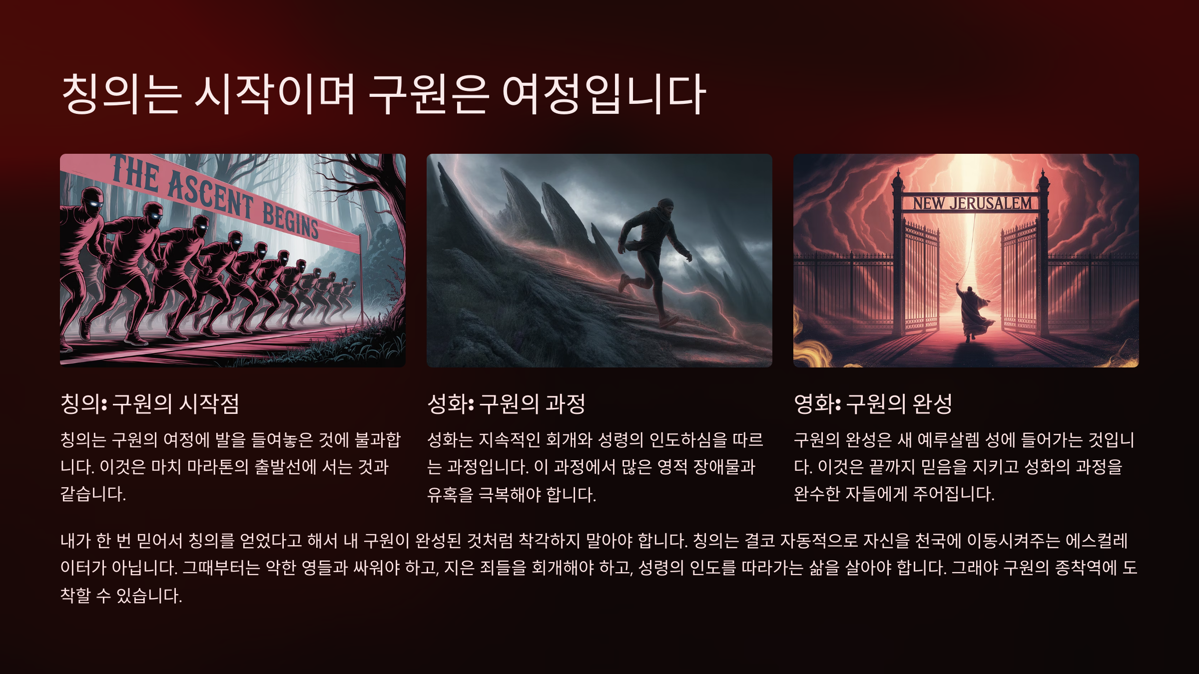 사람의 구원은 그가 주 예수님을 믿어서 그의 이름이 생명책에 기록되는 순간부터 시작된다. 하지만 믿는 순간에 죽는 사람은 거의 없다. 그러므로 그때부터 구원의 여정이 시작되는 것이다. 그래서 칭의를 받은 사람은 그때부터 자신을 거룩하게 만들어가야 한다. 즉 성화의 과정이 필요한 것이다. 성화란 자신을 거룩하게 하고 깨끗하게 하는 것이다. 다시 말해 칭의를 얻어서 자신이 구원을 받았지만 자기 속 내면에는 여전히 죄된 본성이 자리를 차지하고 있다. 그런데 이러한 죄된 본성의 실체는 바로 악한 영들이다. 즉 뱀들과 귀신들인 것이다. 그러므로 우리가 구원의 여정에 있어서 성화의 과정에서 우리는 죄된 본성을 처리해야 하는데 그러기 위해서는 회개가 필요하다. 왜냐하면 자백하는 회개를 할 때 예수님의 피가 우리를 모든 불의에서부터 깨끗하게 해 주기 때문이다. 그리고 나서 사람은 몸의 부활을 입고 영화의 단계로 들어가게 된다. 천국에 입성하는 것이다.