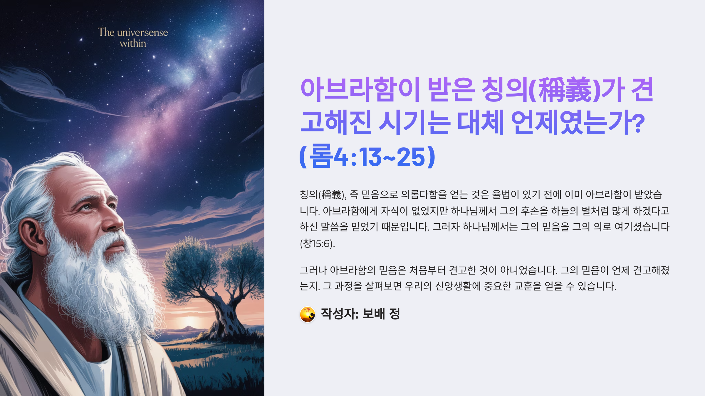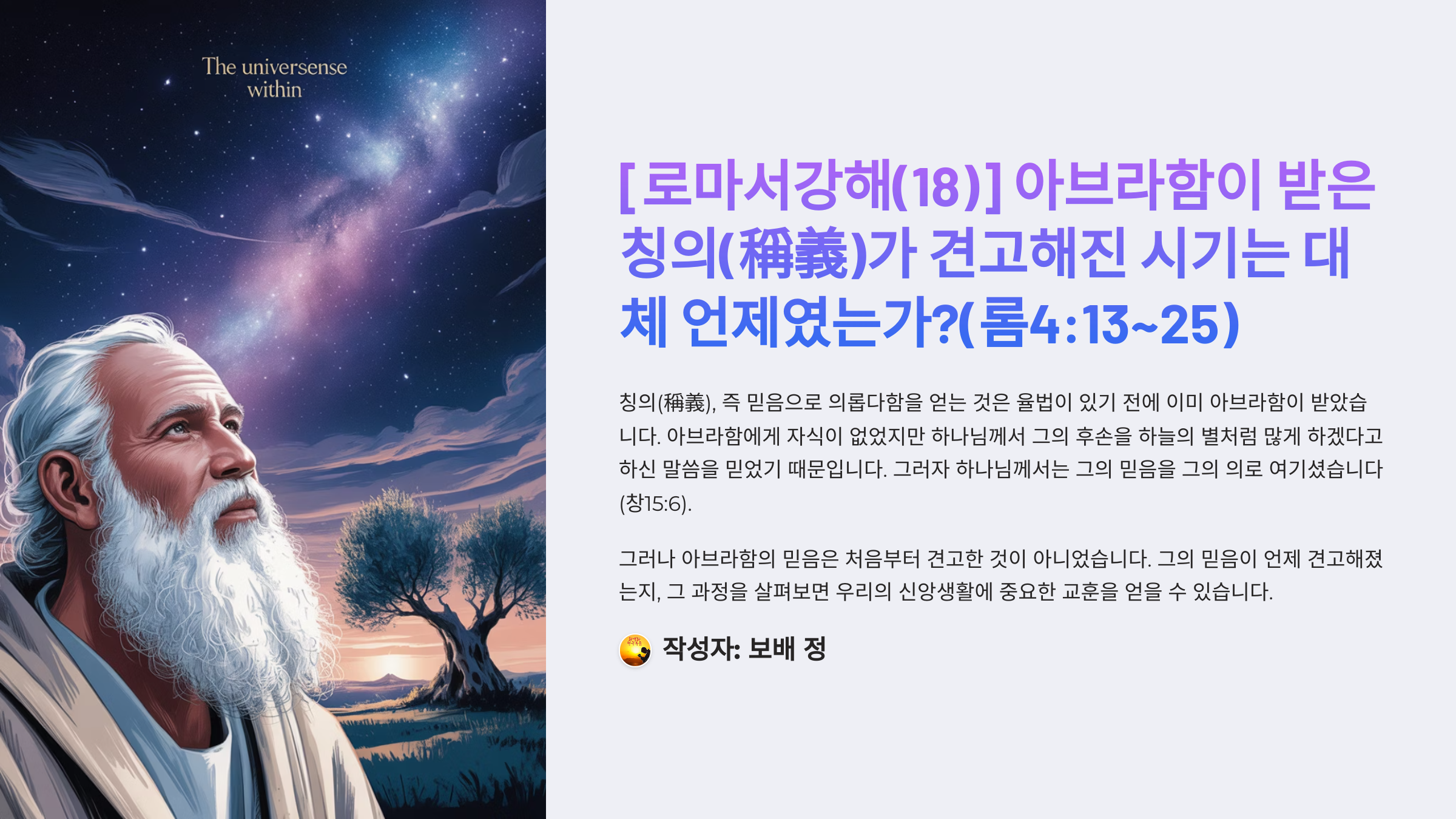 제목: [로마서강해(18)] 아브라함이 받은 칭의(稱義)가 견고해진 시기는 대체 언제였는가?(롬4:13~25)_동탄명성교회 정보배목사