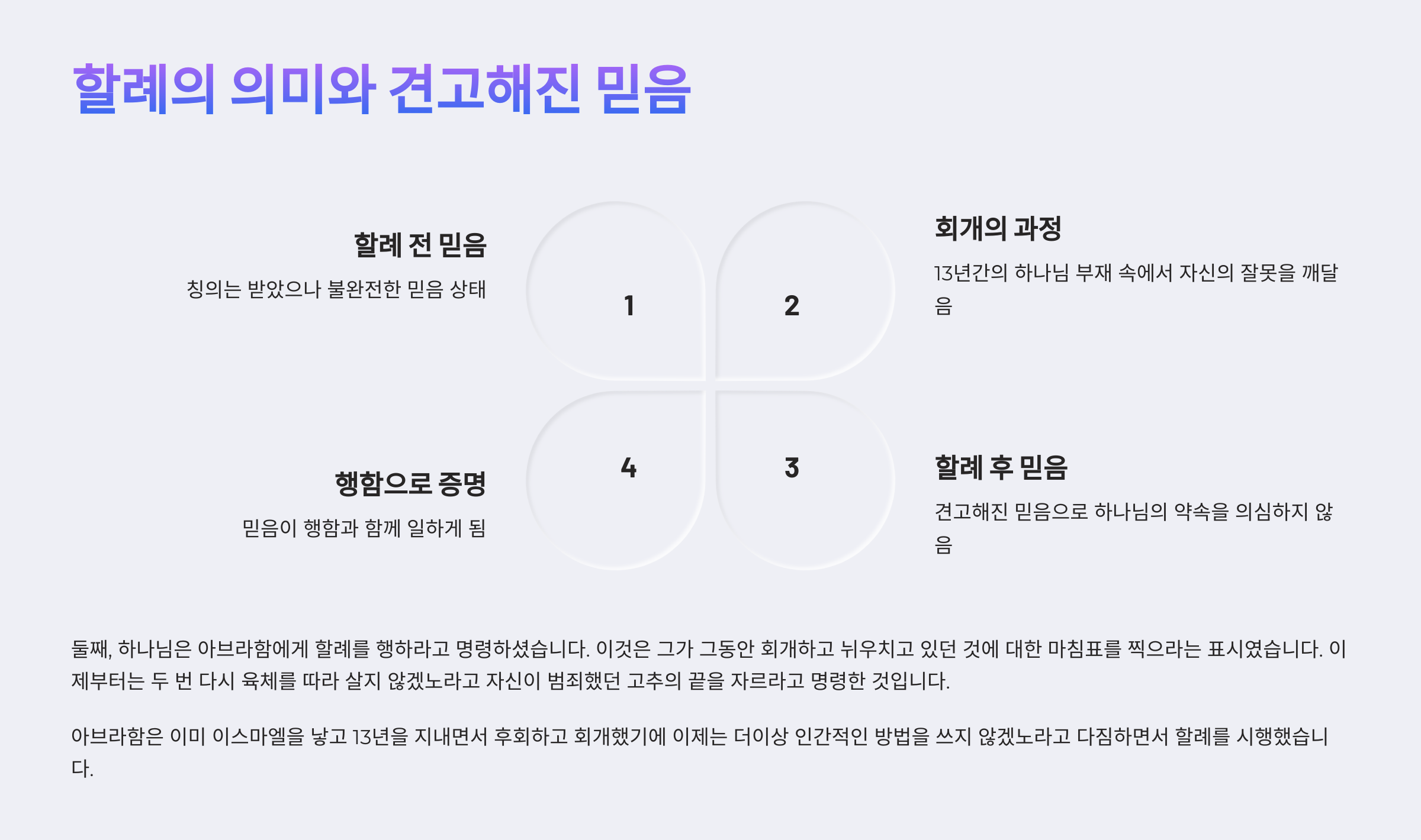 아브라함이 칭의를 얻은 시점은 그의 할례를 받기 전이었다. 그리고 그가 얻은 칭의는 행위로 얻은 것이 아니라 믿음으로 얻은 것이었다. 그러나 그가 칭의를 받았을 때에 그가 가진 믿음은 온전한 것은 아니었다. 왜냐하면 그후로 곧바로 그의 믿음이 흔들렸기 때문이다. 그는 하나님 앞에서 행하지 않았고 또한 완전하지 않았기 때문이다. 그리고 없는 것을 있는 것처럼 부르시는 전능한 하나님을 믿지도 못하고 있었다. 그러므로 하나님께서는 그가 범죄하여 근심하면서 회개하고 있을 때에 그에게 나타나신다. 왜냐하면 그가 자신의 실수를 인정하고 회개하고 있었기 때문이다. 그러자 하나님께서는 99세에 나타나서 그에게 그의 이름을 바꾸게 한 다음 그와 새로운 언약을 체결하셨다. 그리고 그것에 대한 합당한 행위로서 할례를 행하라고 하신다. 그러므로 그날 아브라함은 할례를 행하셨다. 이는 그의 믿음이 이제는 행함과 연결되었다는 것을 의미한다. 그의 행위가 그의 믿음이 온전한 믿음을 갖게 되었음을 반증해주는 것이다. 그러므로 오늘날에 우리도 처음 예수님을 믿었을 때에 가졌던 그 믿음이 줄곧 죽는 날까지 아무런 문제가 없을 것이라고 판단해서는 아니 된다. 아브라함처럼 우리의 믿음도 곧장 흔들릴 수가 있기 때문이다. 그러므로 우리는 날마다 회개해야 한다. 왜냐하면 날마다 회개하는 것만이 내가 처음 믿었을 때에 가졌던 믿음을 더욱 더 견고히 해 주기 때문이다. 그리고 나서 하나님의 초자연적인 역사를 경험할 때에 사람들은 비로소 하나님 앞에 굴복한다. 그리고는 하나님의 말씀에 따라 순종하는 삶을 살게 된다. 그렇다면 지금 나는 어디쯤에 서 있는가? 아브라함의 나이 84세 때에 머물러 있는가? 아니면 85세 때처럼 나도 흔들리고 있는가? 아니라면 아브라함의 나이 99세 때로서 회개를 통하여 견고한 믿음에 서 있는가?