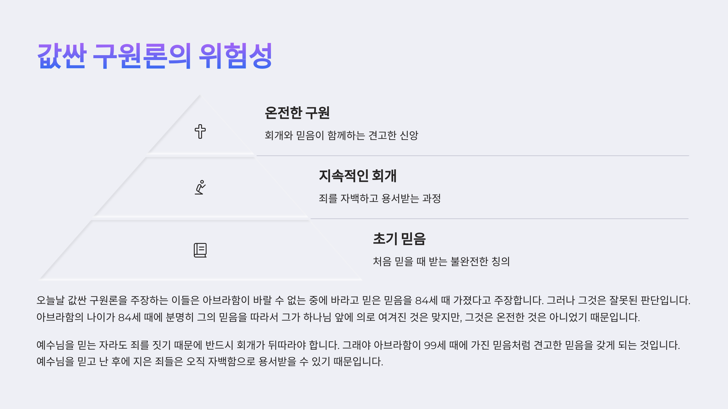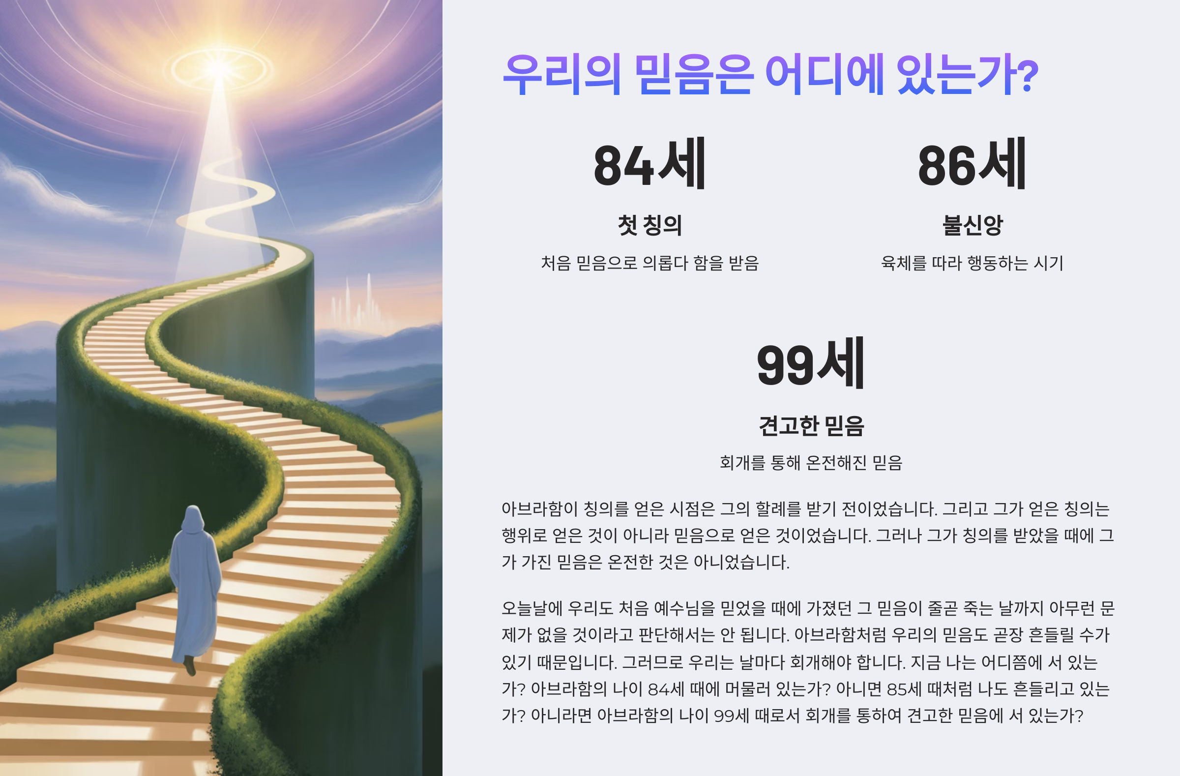 그런데 오늘날 값싼 구원론을 주장하는 이들을 살펴보면, 아브라함이 바랄 수 없는 중에 바라고 믿은 믿음을 84세 때 가졌다고 주장한다. 그러나 그것은 잘못된 판단이다. 아브라함의 나이가 84세 때에 분명히 그의 믿음을 따라서 그가 하나님 앞에 의로 여겨진 것은 맞지만, 그것은 온전한 것은 아니었기 때문이다. 왜냐하면 그후로 그의 믿음이 흔들렸기 때문이다. 그래서 하나님의 약속을 기다리지 못한 채, 아내의 말을 듣고 육체의 방법을 사용아여 아들을 낳았기 때문이다. 그러므로 자신을 구원할 만한 온전한 믿음은 비로소 자신의 잘못을 인정하고 회개하면서 얻게 된 것이다.