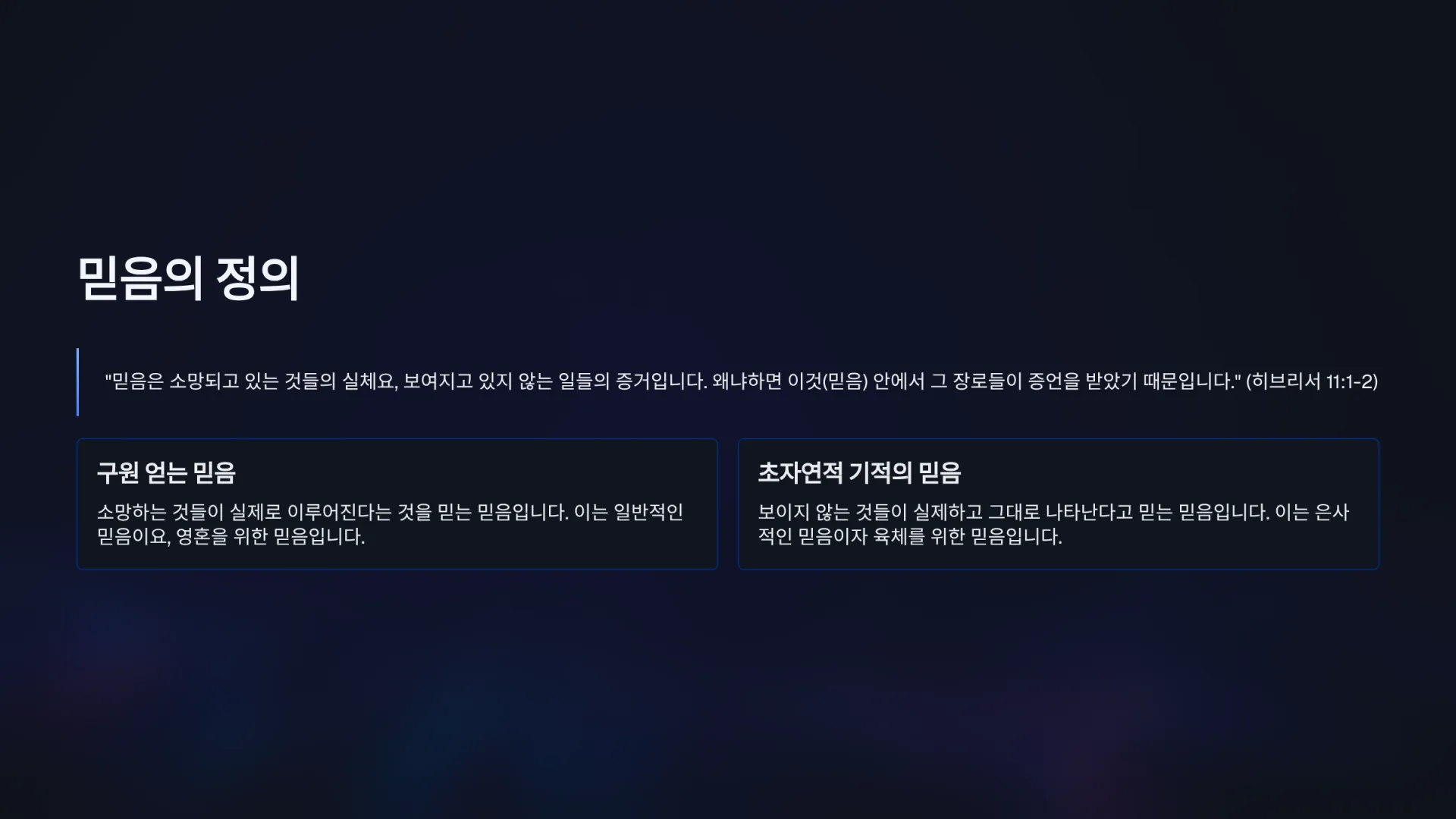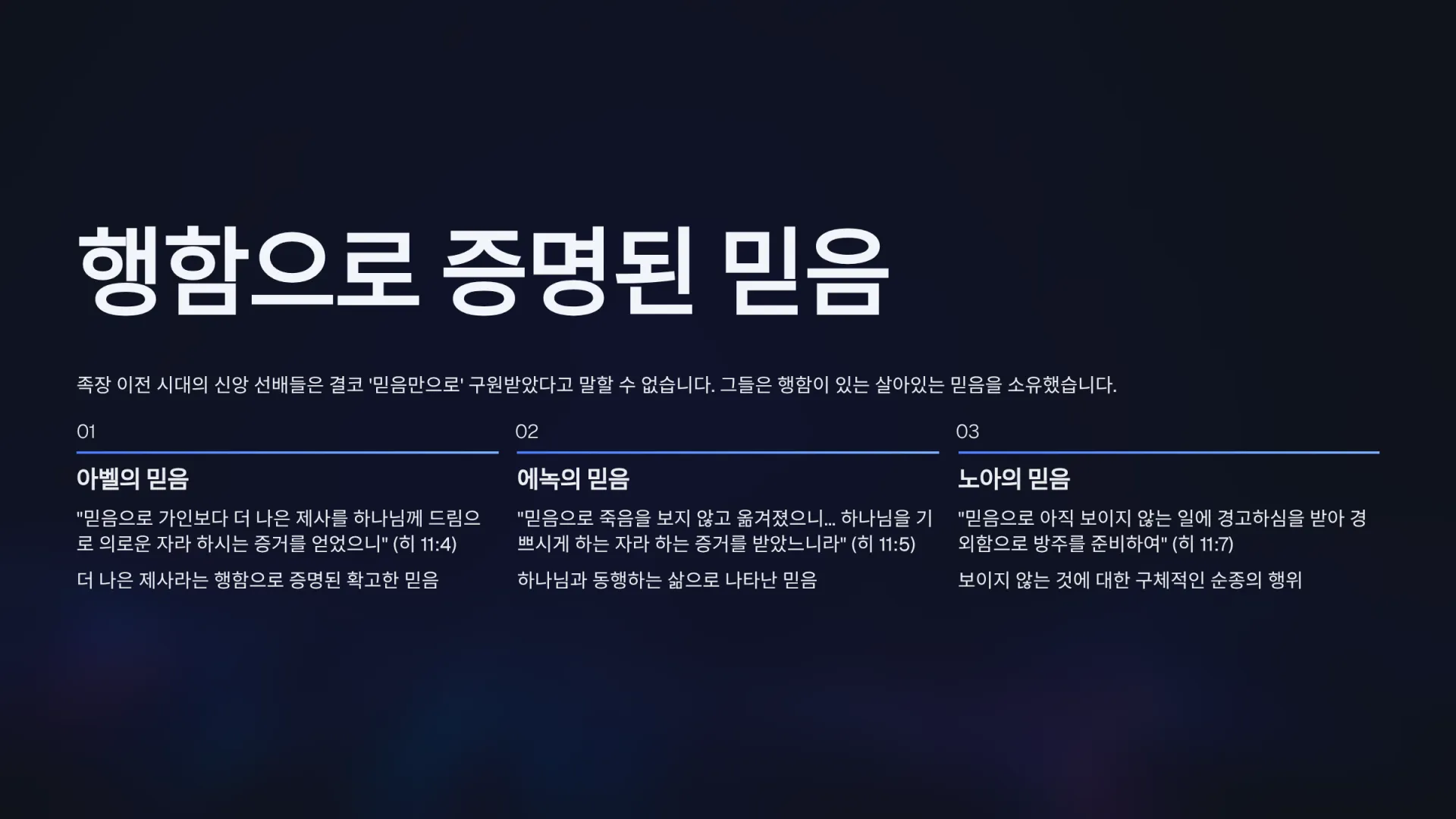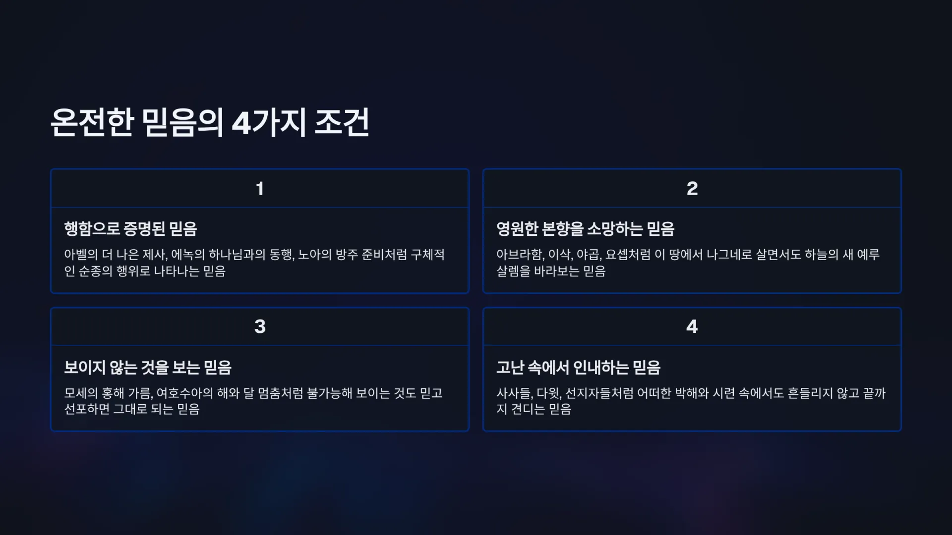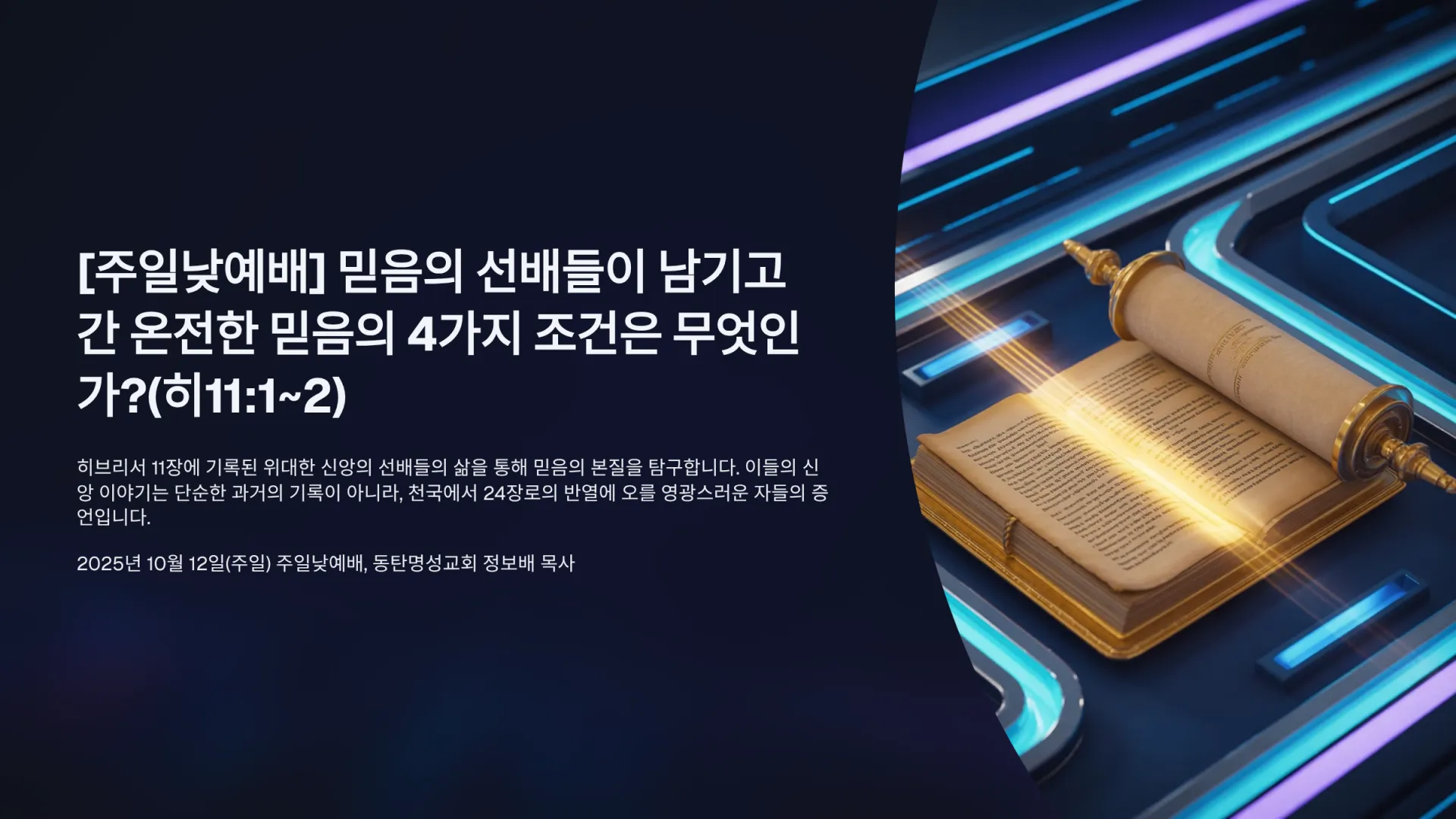 1. [주일1부] 믿음의 선배들이 남기고 간 온전한 믿음의 4가지 조건은 무엇인가?(히11:1~2)_2025-10-12(주일)