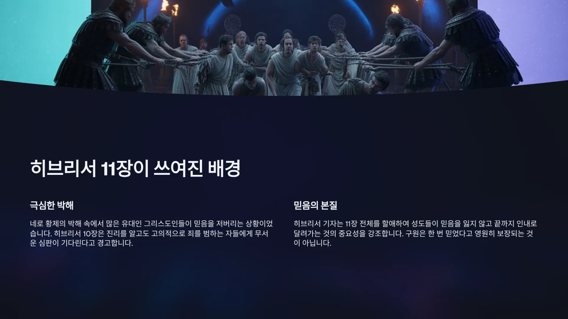 히브리서 11장의 말씀은 히브리서 10장 끝부분의 엄중한 경고와 긴밀하게 연결되어 있다. 히브리서 기자는 10장 26절 이하에서, 진리를 아는 지식을 받고도 고의적으로 죄를 범하는 자들에게는 다시 속죄하는 제사가 없고 하나님의 무서운 심판만이 기다리고 있다고 경고한다. 이러한 경고 앞에서, 히브리서 기자는 성도들이 로마의 극심한 박해와 배교의 유혹 속에서 믿음을 잃지 않고 끝까지 인내로 달려가라고 하면서 11장을 할애하여 기록하였다.