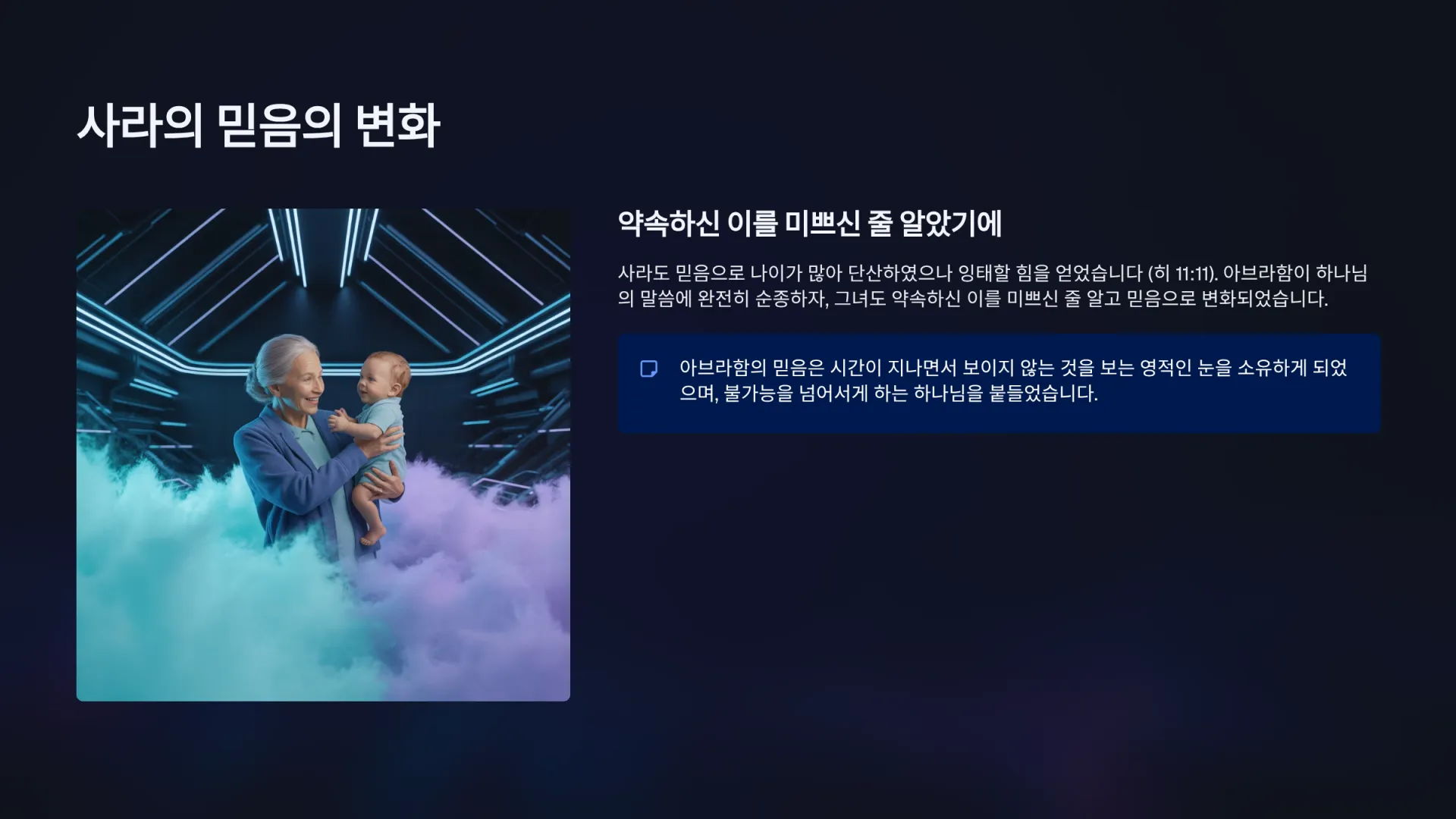 [설교요약] 본 설교는 히브리서 11장 1-22절에 기록된 믿음의 선배들(아벨, 에녹, 노아, 아브라함, 사라, 이삭, 야곱, 요셉)의 신앙 이야기를 통해 '믿음'의 본질과 그것이 오늘날 우리에게 주는 교훈을 다룬다. 히브리서 11장은 10장의 경고에 이어, 믿음을 잃지 않고 인내하도록 격려하기 위해 기록되었으며, 믿음이 단순히 구원의 시작이 아닌 행함으로 완성되는 것임을 강조한다. 첫째, 믿음은 ‘바라는 것들의 실상’이요 ‘보이지 않는 것들의 증거’(히 11:1)이다. 둘째, 히브리서 11장 2절의 ‘장로들’은 24장로를 의미하며, 이들의 믿음은 구원과 더 높은 천국 기업을 얻기 위한 조건이다. 셋째, 족장 이전의 아벨, 에녹, 노아는 ‘더 나은 제사’, ‘하나님과 동행’, ‘방주 준비’와 같은 행함으로 믿음을 증명했고(히 11:4-7), 넷째, 아브라함, 이삭, 야곱, 요셉은 약속을 믿고 순종하며 영원한 본향을 소망하는 나그네의 삶을 살았다(히 11:8-22). 이들의 삶은 참된 믿음이 보이지 않는 것을 확신하고 순종하며 인내하는 행위임을 보여주며, 우리 또한 믿음의 경주를 완주하여 영원한 기업을 얻어야 함을 촉구한다(히 12:1).