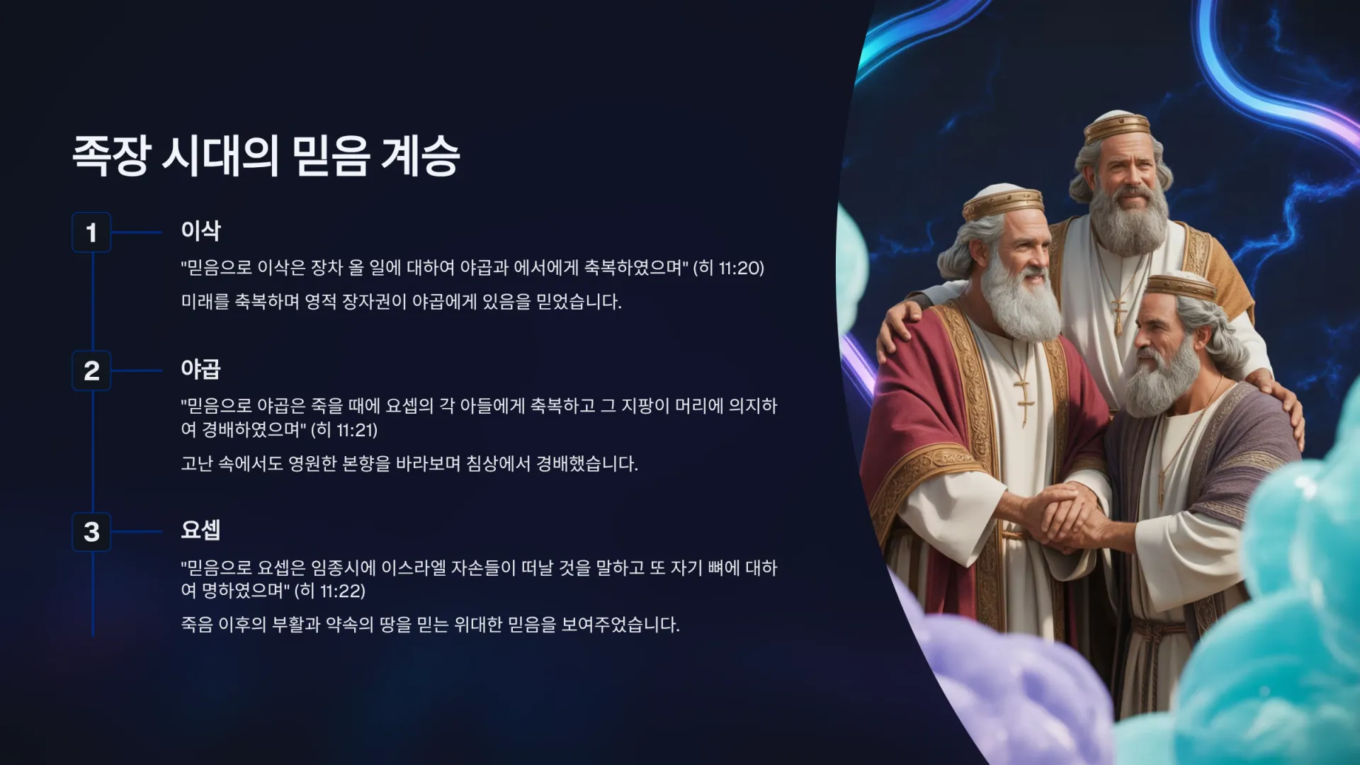 둘째로, 이제는 이삭, 야곱, 요셉의 믿음을 살펴보자. 이들은 아브라함으로부터 시작된 믿음의 유산을 이어받은 자들이다. 그들은 각자의 삶의 자리에서 아브라함의 믿음을 계승하고 증명했다. 하나, 이삭은 미래를 축복하는 믿음의 삶을 살았다. “믿음으로 이삭은 장차 올 일에 대하여 야곱과 에서에게 축복하였으며”(히 11:20)라고 기록되어 있다. 이삭은 자신의 죽음을 앞둔 상태에서, 하나님의 섭리에 따라 둘째 아들인 야곱을 축복했다. 사실 그가 야곱을 축복하고 나서도 한참을 더 살았다. 그 당시에는 눈이 흘려 에서와 야곱을 분간하지 못했지만, 히브리서 기자에 따르면 아마도 그의 내면에서는 비록 에서가 장자이기는 했지만 영적 장자권이 야곱에게 있다는 것을 알고 있었던 것으로 보인다. 그리하여 이삭도 믿음으로 야곱을 축복해주었다. 이는 자신에게 주어진 하나님의 약속을 끝까지 신뢰하면서, 인간적인 혈통이 아니라 영적인 질서 안에서 하나님의 약속이 내려간다는 믿음을 소유하고 있었음을 알 수 있다. 둘, 야곱은 고난 속에서도 영원한 본향을 바라본 믿음의 삶을 살았다. “믿음으로 야곱은 죽을 때에 요셉의 각 아들에게 축복하고 그 지팡이 머리에 의지하여 경배하였으며”(히 11:21)라고 기록되어 있다. 비록 야곱의 삶이 고난의 연속이었지만, 그는 모든 상황을 믿음과 기도로 이겨내었다. 그리고 늙어서는 애굽으로 내려가 하나님의 백성이 하늘의 별처럼 바닷가의 모래처럼 번성할 땅에 안착한다. 그리고 죽음을 앞둔 상황에서는 애굽의 총리였던 요셉에게 두 아들들을 데려오게 한다. 그리고 그의 두 아들들에게 축복한다. 그때 그는 자신의 삶이 하나님의 섭리 안에 있었다는 사실을 고백하면서 영원한 본향을 바라보며 침상에서 경배하는 모습을 보여준다. 셋, 요셉은 죽음을 넘어선 부활과 약속의 땅을 믿는 삶을 살았다. “믿음으로 요셉은 임종시에 이스라엘 자손들이 떠날 것을 말하고 또 자기 뼈에 대하여 명하였으며”(히 11:22)라고 기록되어 있기 때문다. 요셉은 사실 파란만장한 삶을 살았다. 형들의 시기로 인해 몇 번의 죽음의 고비를 넘기고 애굽에 종으로 팔려갔지만 애굽의 총리가 된다. 그리고 왕좌 외에는 다른 모든 것을 얻어 왕이나 진배가 없었다. 하지만 그의 마음은 항상 어릴 적 장막에서 들었던 조상들의 이야기였다. 하나님께서 그들의 조상과 그의 후손에게 젖과 꿀이 흐르는 가나안 땅을 기업으로 주셨다는 것이다. 그러므로 그는 죽을 때에 조상들의 약속에 참여하고자, 자신이 죽더라도 자신의 뼈를 꼭 약속의 땅 가나안으로 가져가라는 유언을 남긴다. 그리하여 그는 죽음 이후의 부활의 영광과 하나님의 약속의 성취가 반드시 있을 것임을 믿는 위대한 믿음을 보여주었다. 그렇다. 이렇듯 이삭과 야곱과 요셉의 믿음은 아브라함에게 주어진 약속이 한 세대를 넘어 다음 세대로 넘어간다고 할지라도 절대 흐릿해지거나 없어지는 것이 아니라, 계속해서 살아서 빛나는 믿음이었음을 알 수 있다. 우리에게도 과연 이러한 영적 DNA 유전자가 있을까? 우리 모두도 그들처럼 나그네 길 인생을 살아가고 있다. 하지만 우리도 그들처럼 하늘의 영원한 본향을 바라보며 살아야 할 것이다.