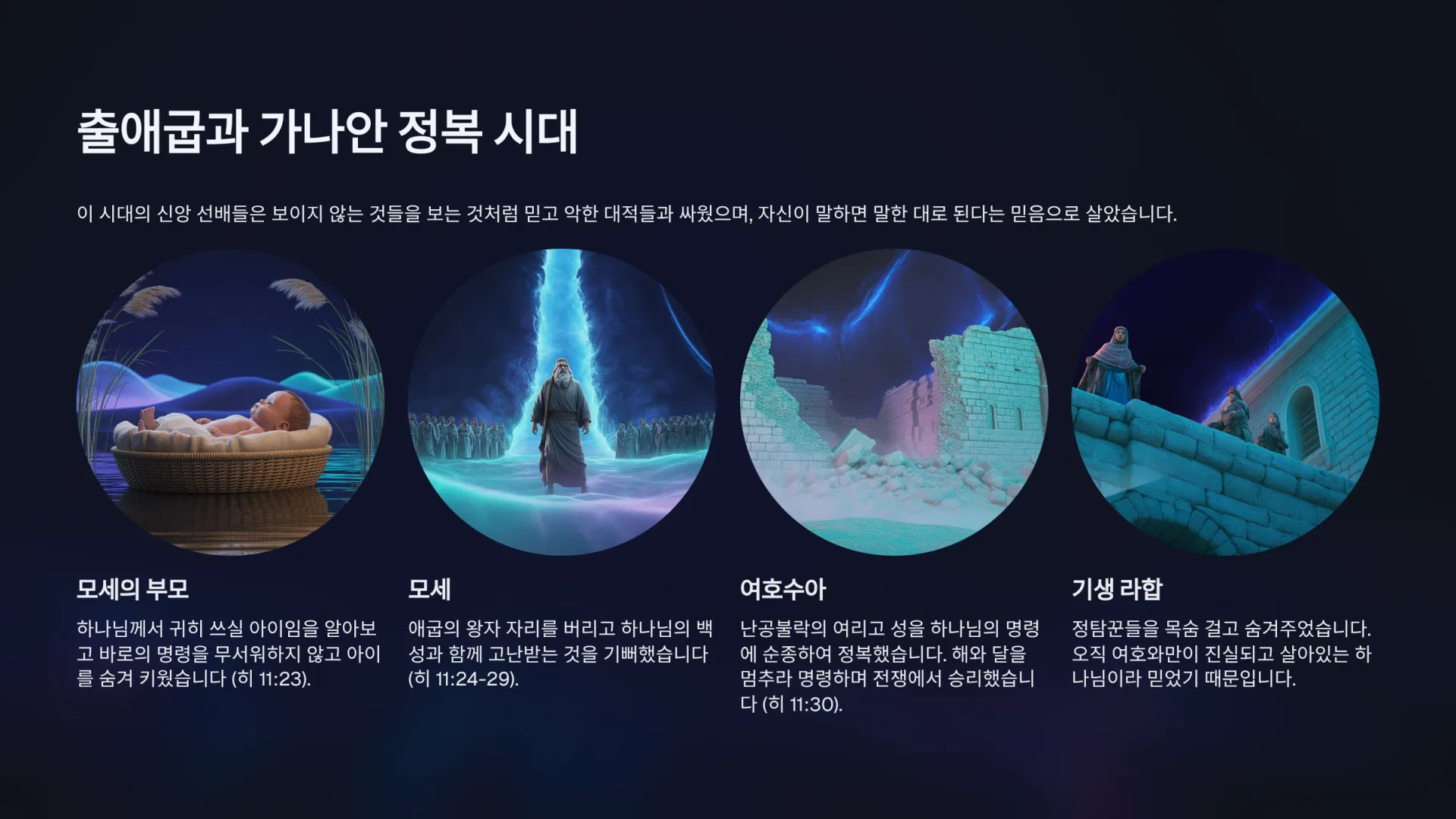 첫째로, 출애굽과 가나안 정복시대의 신앙 선배들의 믿음을 살펴보자. 이들은 보이지 않는 것들을 보는 것처럼 믿고 악한 대적들과 싸웠으며, 자신이 말하면 말한대로 된다는 믿음으로 살았다는 사실을 알 수 있다. 왜냐하면 그 시대의 대표적인 인물로서 모세의 부모와 모세, 여호수아와 기생 라합이 그렇게 살았기 때문이다.