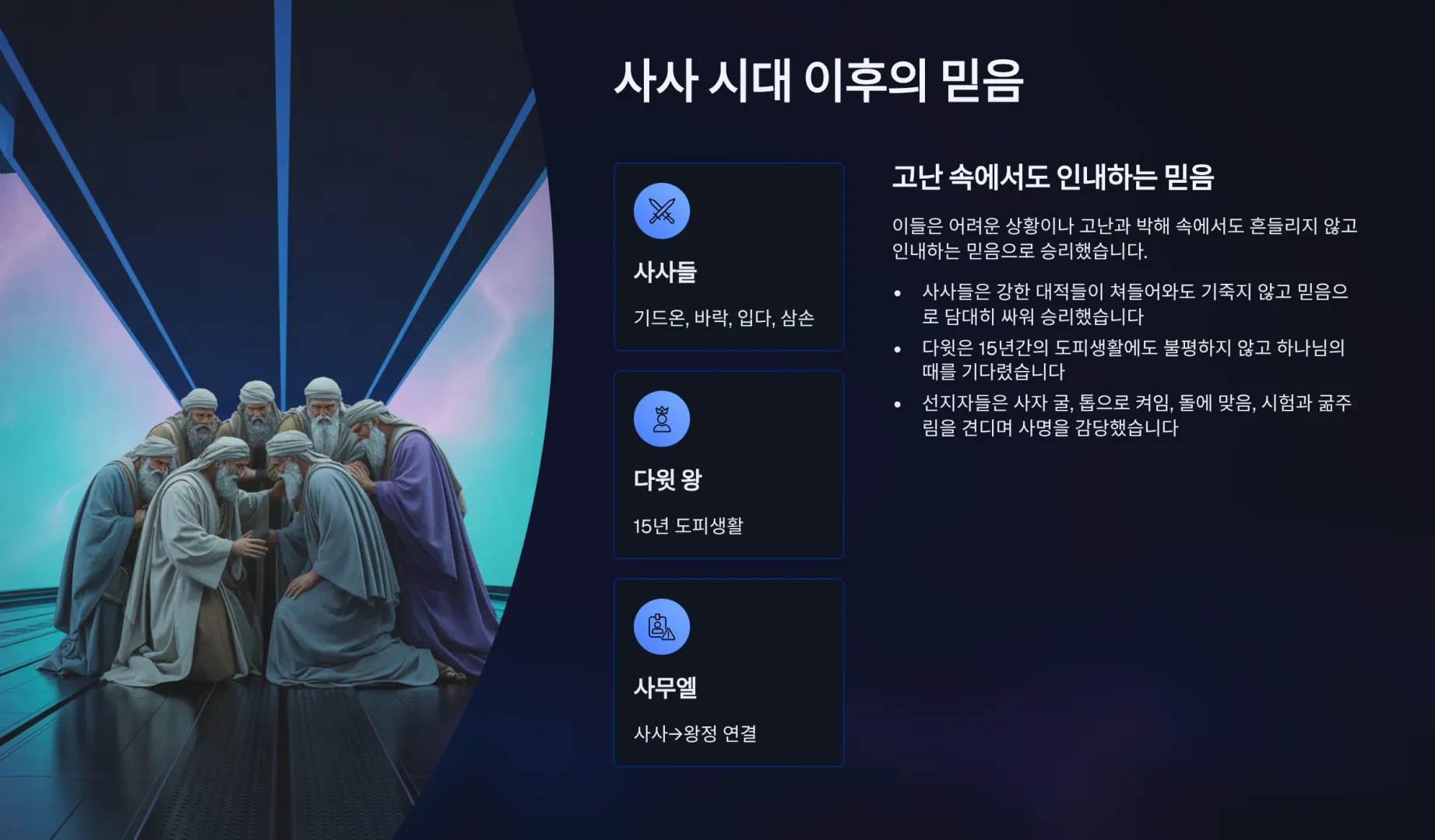 둘째로, 사사 시대 이후의 신앙 선배들의 믿음은 어떠했는가? 이들은 한 마디로 어려운 상황이나 고난과 박해 속에서도 흔들리지 않고 인내하는 믿음으로 승리했다는 것이다. 먼저 여호수아 이후의 세대들이었던 사사들로서 기드온, 바락, 입다, 삼손은 주변의 강한 대적들이 쳐들어왔지만 기죽지 않고 믿음으로 담대히 나가서 싸워서 승리한 사람들이다. 그리고 다윗 왕은 15년간의 도피생활에도 불구하고 불평하지 않고 하나님의 때를 기다려 전무후무한 왕이 될 수 있었다. 그리고 선지자 사무엘은 아이를 낳을 수 없는 어머니였지만 끈질긴 기도 끝에 태어난 아들로서 사사시대에서 왕정시대로 이어지는 끈을 연결해주는 사람이었다. 그리고 여러 선지자들 중에 다니엘은 신앙을 지키려다가 사자 굴 속에 던져지는 고난을 겪기도 하였으며, 이사야 선지자는 므낫세 왕에 의해 톱으로 켜는 고통을 당해야 했으며, 어떤 이는 돌에 맞기도 하고, 어떤 이는 시험과 굶주림과 환난과 학대를 받았으며 끝까지 인내하면서 사명을 감당했던 사람들이었다. 그렇다. 그들은 하나님의 때를 기다릴 줄 알았고 동시에 어떠한 핍박과 고난중에서도 견디어 이겨내었던 인물들이었던 것이다.