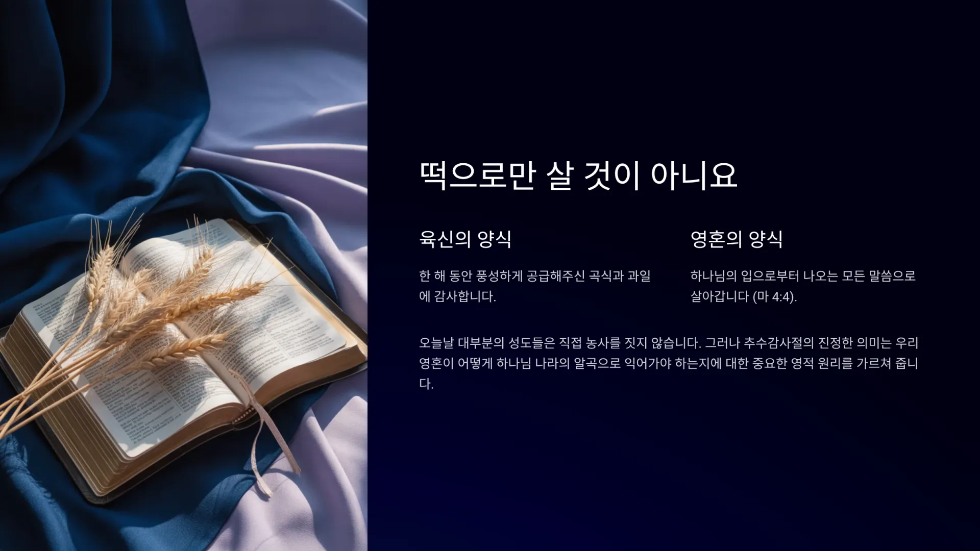 오늘은 저희 교회가 추수감사주일로 지키는 절기이다. 추수감사주일은 한 해 동안 풍성한 곡식과 과일을 주신 하나님께 감사하는 절기이다. 특별히 우리의 육신을 위한 양식을 풍성하게 공급해주신 하나님의 은혜에 감사하는 날이다. 그러나 마태복음 4장 4절에서는 “사람이 떡으로만 살 것이 아니요 하나님의 입으로부터 나오는 모든 말씀으로 살 것이라”고 말씀한다. 이는 육신의 양식만큼이나, 아니 그보다 더 중요한 영혼의 양식이 있음을 우리에게 가르쳐 준다. 오늘날 대부분의 성도들은 직접 농사를 짓지 않는다. 그래서 ‘내가 농사짓지도 않았는데 왜 추수감사절을 지켜야 하는가?’라고 생각할 수도 있다. 그러나 추수감사절의 진정한 의미는 단순히 육신의 양식에 대한 감사를 넘어, 우리 영혼의 추수와 깊은 관련이 있다. 하나님께서는 자연의 추수 과정을 통해 우리 영혼이 어떻게 하나님 나라의 알곡으로 익어가야 하는지에 대한 중요한 영적 원리를 가르쳐 주시기 때문이다.