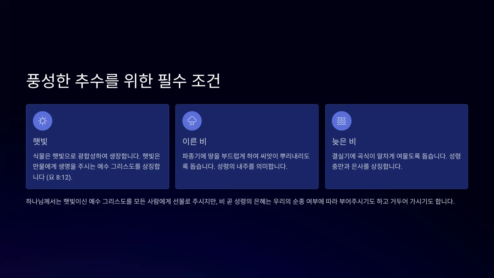 아름다운 곡식과 과일이 풍성하게 열리기 위해서는 여러 조건이 필요하지만, 그중에서도 가장 필수적인 것은 햇빛적절한 때에 내리는 비이다.