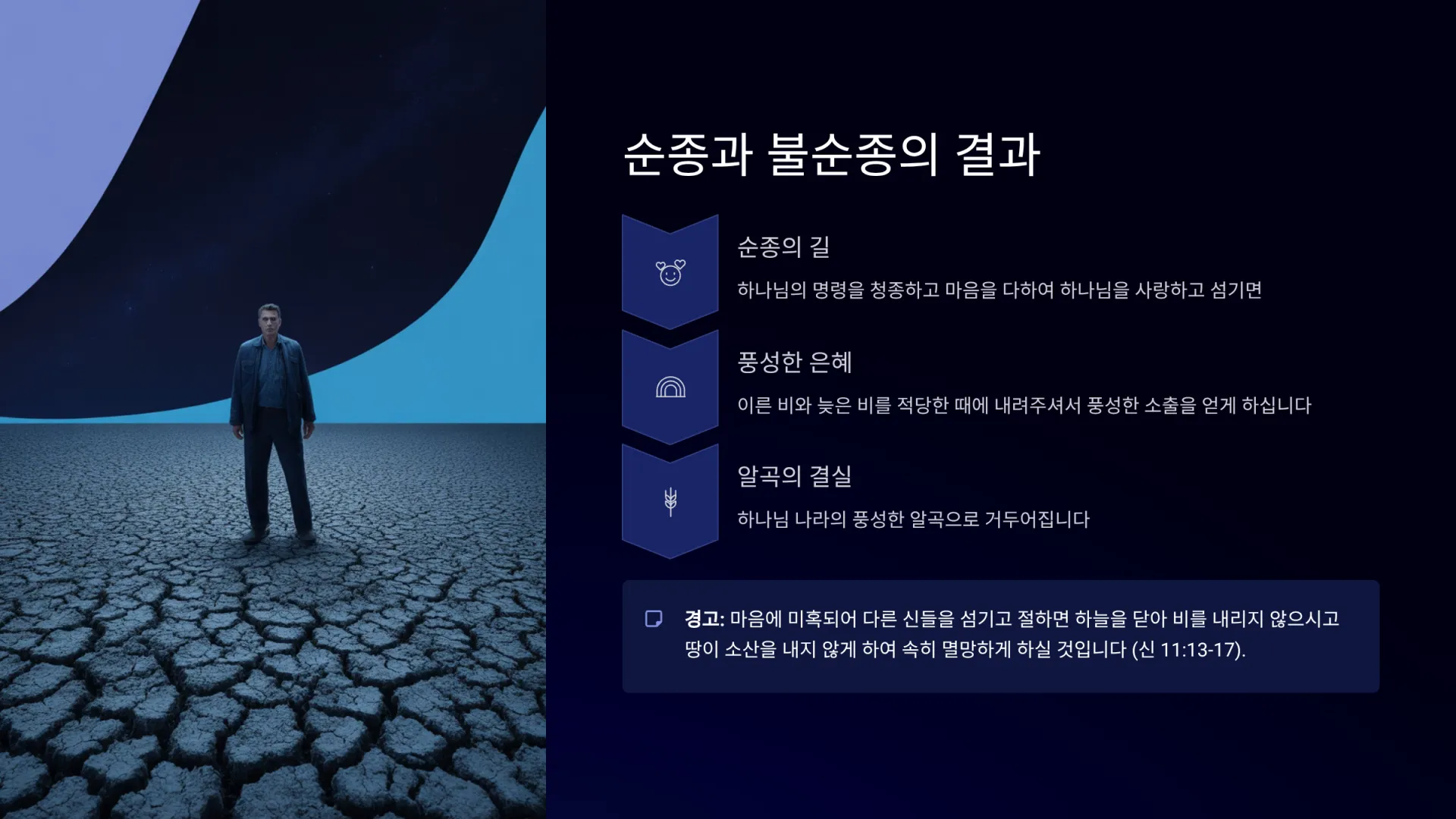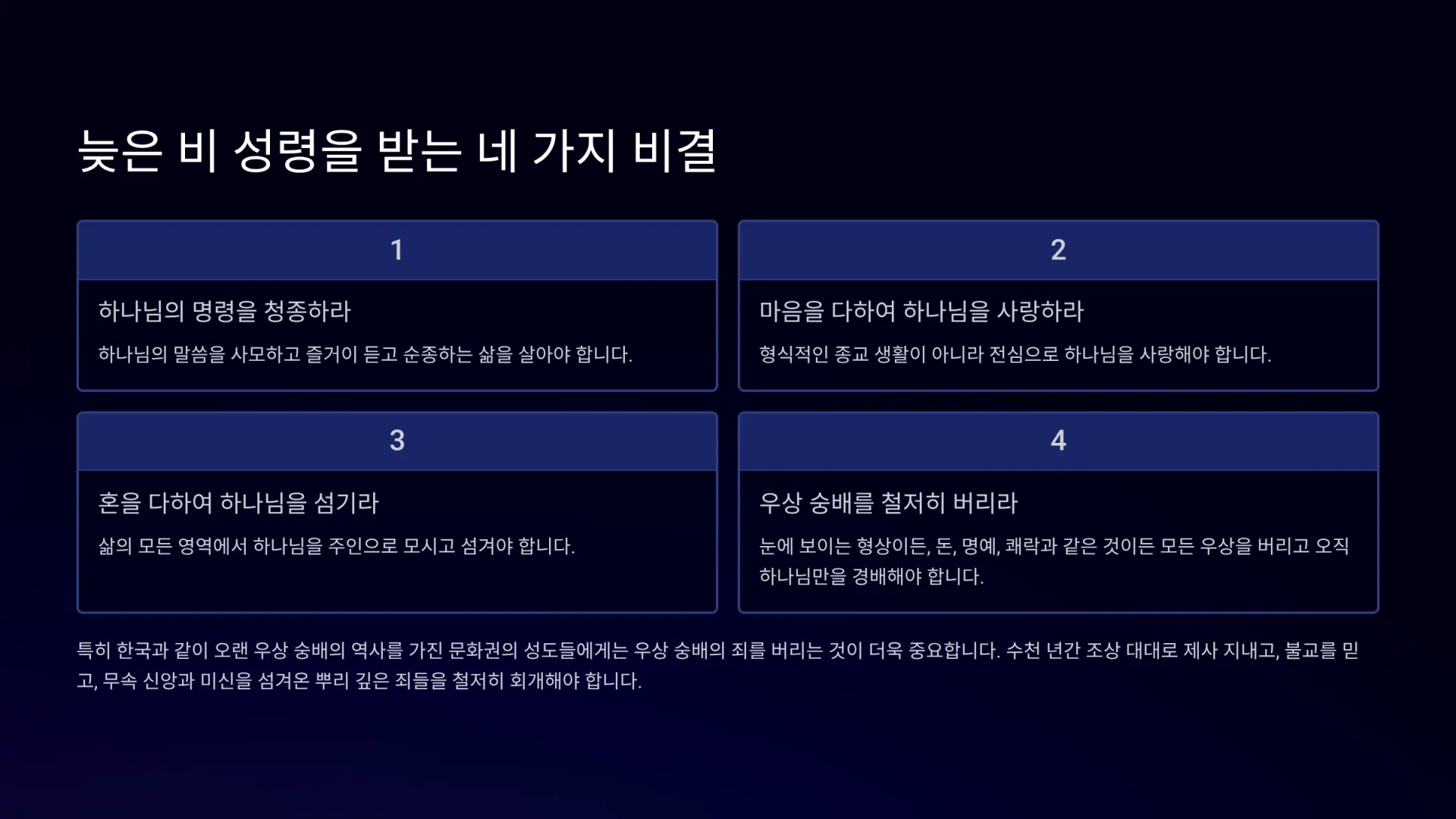 그런데 오늘날, 특히 한국과 같이 오랜 우상 숭배의 역사를 가진 문화권의 성도들에게는 네 번째 조건, 즉 우상 숭배의 죄를 버리는 것이 더욱 중요하다. 이스라엘 백성은 대대로 하나님을 섬겨왔기에 주로 말씀 순종과 사랑의 문제에 초점이 맞춰졌지만, 우리는 수천 년간 조상 대대로 제사 지내고, 불교를 믿고, 무속 신앙과 미신을 섬겨왔다. 이러한 뿌리 깊은 우상 숭배의 죄들을 철저히 회개하지 않고서는 성령의 풍성한 은혜(늦은 비)를 받기 어렵다. 오히려 하나님께서 하늘 문을 닫으시고 비를 내리지 않으실 수 있다(신 11:16-17).