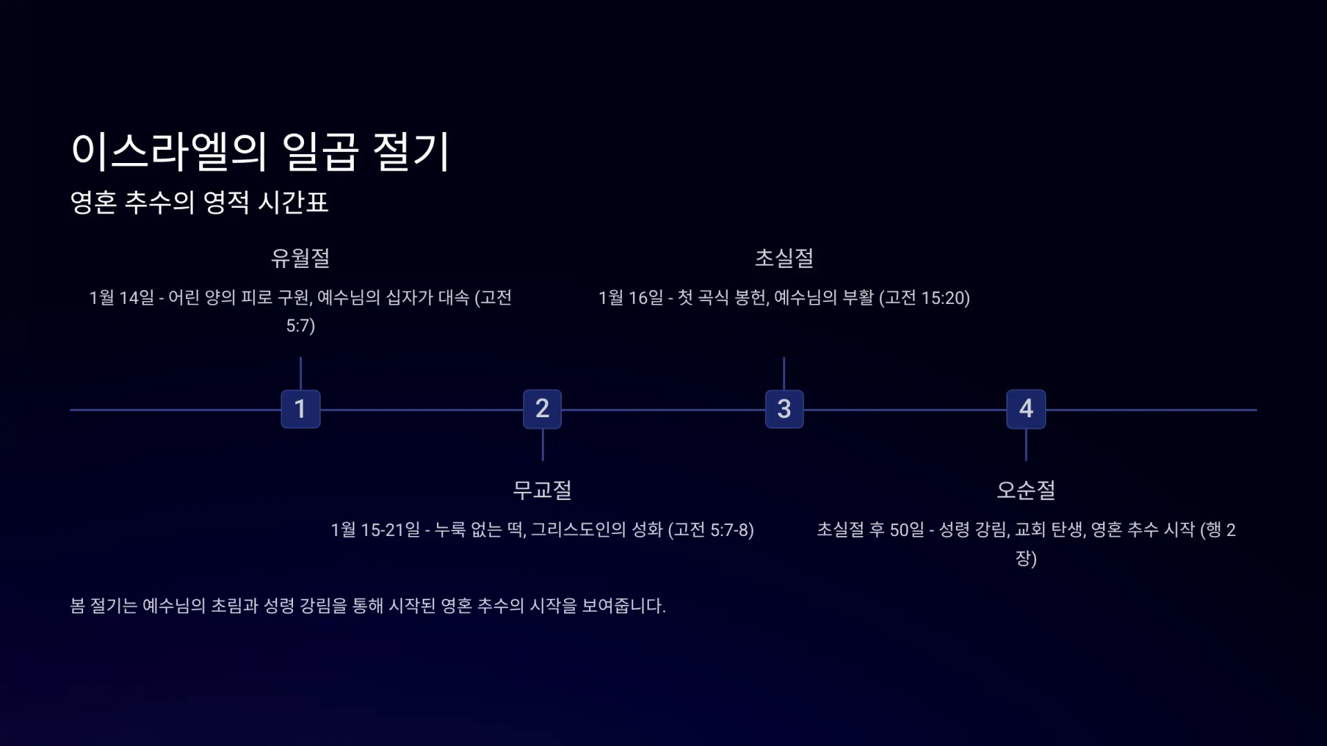 하나님께서는 이스라엘 백성에게 일곱 가지 절기를 지키도록 명하셨다(레 23장). 이 절기들은 단순히 과거의 역사적 사건을 기념하거나 농사 주기에 따른 감사 축제를 넘어, 예수 그리스도를 통한 하나님의 구원 계획과 영혼 추수의 전 과정을 예표적으로 보여주는 중요한 영적 시간표이다. 일곱 절기는 크게 봄 절기와 가을 절기로 나뉜다.