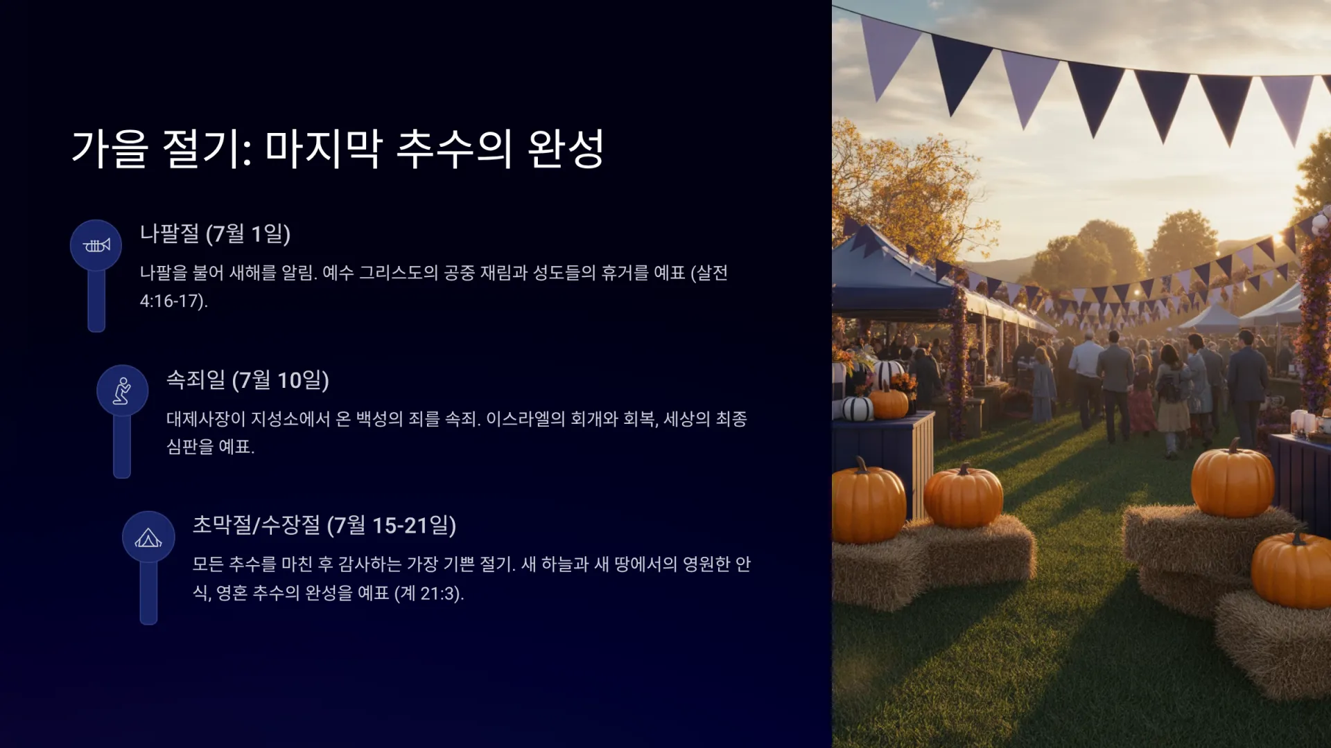 둘째, 가을 절기(예수님의 재림과 추수 완성 관련)가 있다. 가을 절기에는 첫째로, 나팔절(7월 1일)이 있다. 나팔을 불어 새해(민간력)의 시작과 하나님의 임재를 알리는 날이다(레 23:23-25). 이는 예수 그리스도의 공중 재림과 성도들의 휴거를 예표할 가능성이 높다(살전 4:16-17; 고전 15:52). 둘째로, 속죄일(7월 10일)이 있다. 대제사장이 지성소에 들어가 온 백성의 죄를 속죄하는 가장 거룩한 날이다(레 16장; 23:26-32). 이는 환난기 동안 이스라엘의 회개와 회복, 또는 아마겟돈 전쟁을 통한 세상의 최종적인 심판과 정화를 예표할 수 있다. 셋째로, 초막절(수장절)(7월 15-21일)이 있다.  광야에서의 장막 생활을 기념하고 모든 곡식과 과일 추수를 마친 후 하나님께 감사하는 가장 기쁜 절기이다(레 23:33-43). 이는 새 하늘과 새 땅에서의 영원한 안식과 하나님과의 동행(영혼 추수의 완성)을 예표한다(계 21:3).