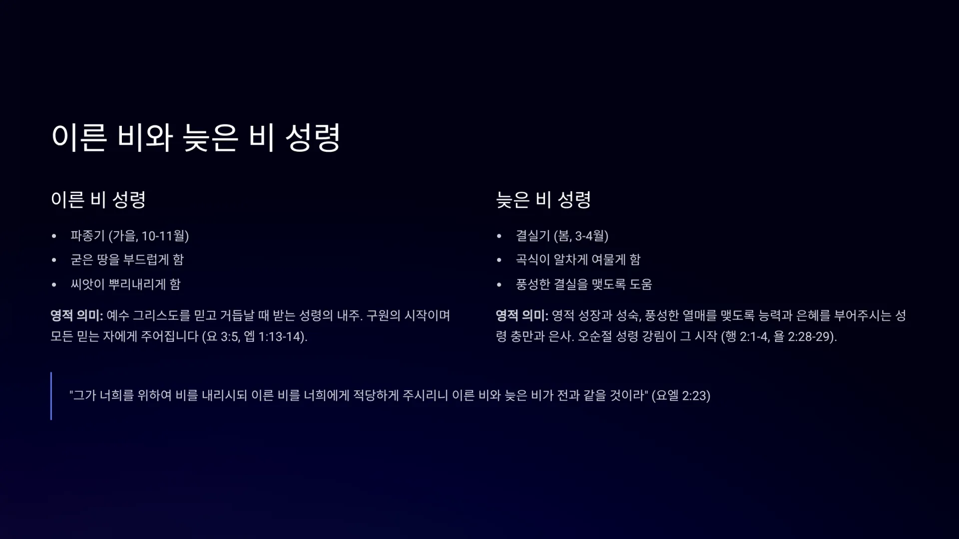 풍성한 곡식 추수를 위해 파종기의 ‘이른 비’와 결실기의 ‘늦은 비’가 필수적이듯이, 우리 영혼이 알곡으로 결실하기 위해서도 ‘이른 비 성령’과 ‘늦은 비 성령’이 필요하다. 이는 요엘 선지자의 예언(욜 2:23, 28-29)과 베드로 사도의 오순절 설교(행 2:16-21)를 통해 확인할 수 있다.