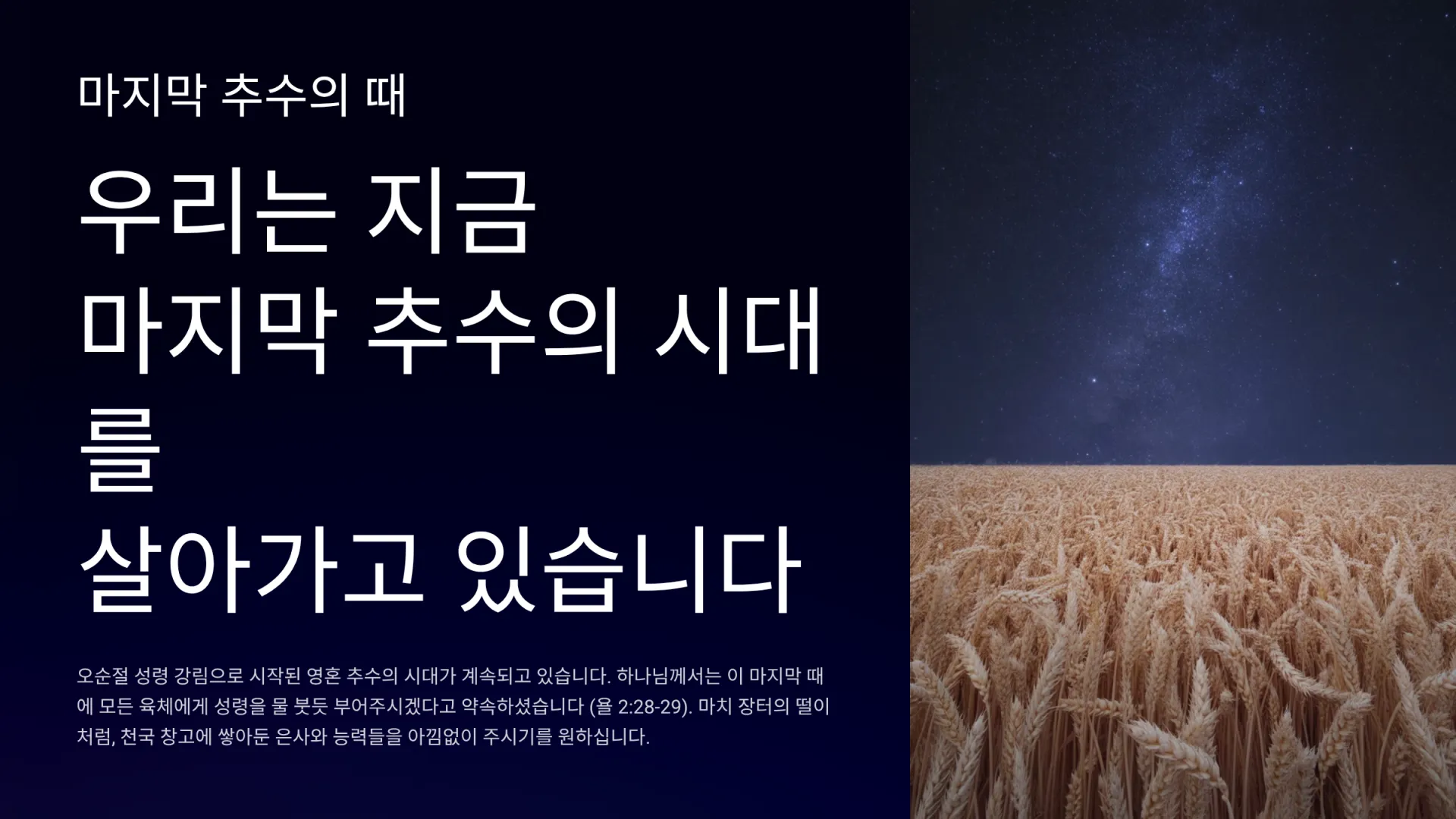 지금 우리는 오순절 성령 강림 이후 마지막 추수를 향해 달려가는 시대에 살고 있다. 이 마지막 때에 하나님께서는 약속대로 늦은 비 성령을 풍성하게 부어주시기를 원하신다(욜 2:23, 28-29). 이 성령의 은혜를 받아 풍성한 알곡으로 익어갈 것인가, 아니면 성령의 은혜를 소홀히 하여 쭉정이가 될 것인가? 이는 우리의 영원한 운명을 결정하는 중요한 문제이다. 따라서 오늘 추수감사주일을 맞아, 우리는 육신의 양식에 대한 감사와 더불어, 우리 영혼을 알곡으로 익어가게 하시는 하나님의 은혜, 특히 성령의 역사에 감사해야 한다. 또한 이스라엘 절기에 나타난 영적 추수의 원리를 깨닫고, 마지막 때를 살아가는 우리가 어떻게 성령의 은혜를 받아 풍성한 알곡으로 하나님 나라 곳간에 들어가게 될 것인지 함께 살펴보는 귀한 시간이 되기를 원한다.