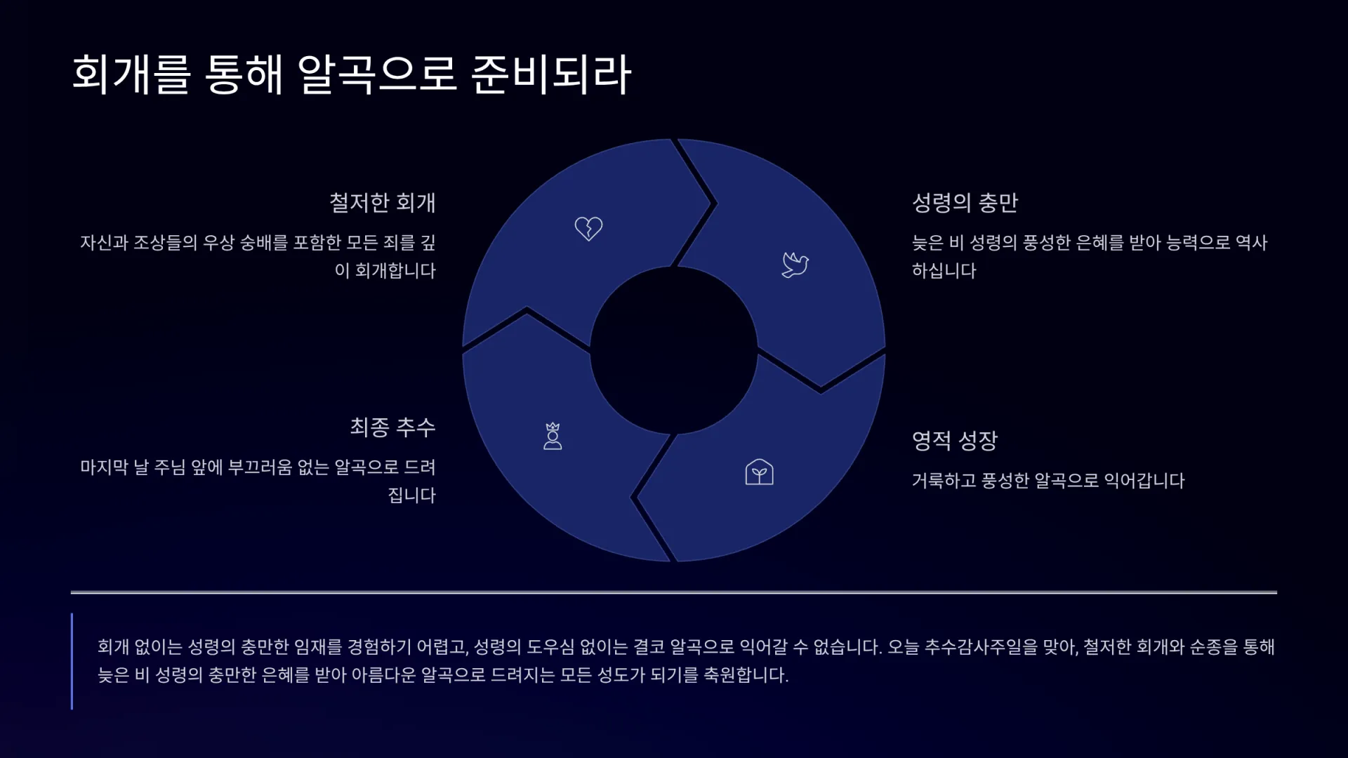 회개 없이는 성령의 충만한 임재를 경험하기 어렵고, 성령의 도우심 없이는 결코 알곡으로 익어갈 수 없다. 오늘 추수감사주일을 맞아, 육신의 양식뿐 아니라 영혼의 풍성한 추수를 위해 이른 비와 늦은 비 성령을 보내주시는 하나님께 깊이 감사하자. 그리고 더 나아가 철저한 회개와 순종을 통해 늦은 비 성령의 충만한 은혜를 받아, 마지막 날 주님 앞에 섰을 때 부끄러움 없는 아름다운 알곡으로 드려지는 모든 성도가 되기를 간절히 축원한다.