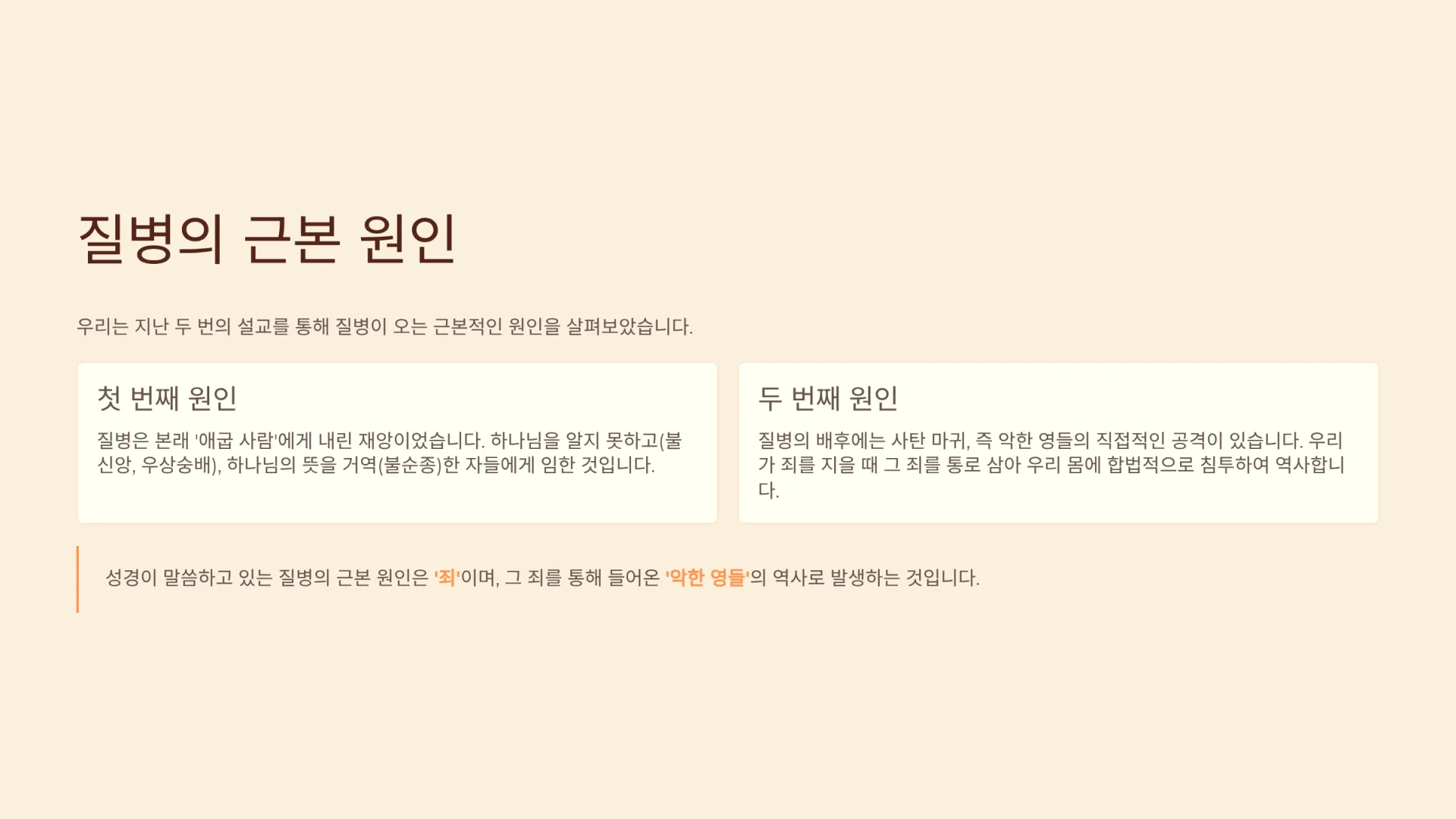 결국, 성경이 말씀하고 있는 질병의 근본 원인은 ‘죄’이며, 그 죄를 통해 들어온 ‘악한 영들’의 역사로 발생하는 것이다. 이 영적인 문제를 해결하지 않고서는 완전한 치유를 경험하기 어렵다. 그리고 이 모든 문제를 푸는 열쇠는 바로 ‘회개’이다.