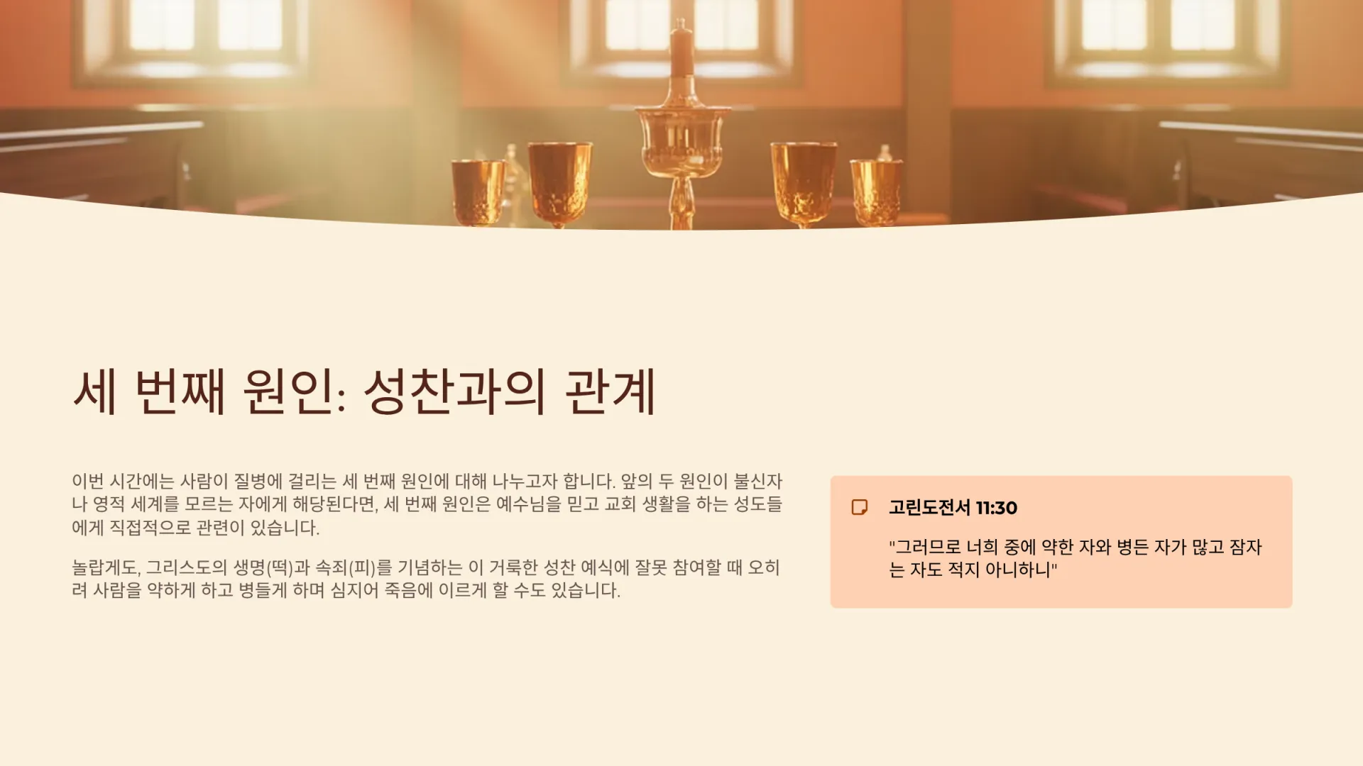 그리고 이번 시간에는 사람이 질병에 걸리는 세 번째 원인에 대해 나누고자 한다. 앞의 두 원인이 불신자나 영적 세계를 모르는 자에게 해당된다면, 세 번째 원인은 예수님을 믿고 교회 생활을 하는 성도들에게 직접적으로 관련이 있다. 그것은 바로 ‘성찬(聖餐)’과 관련이 있다. 놀랍게도, 그리스도의 생명(떡)과 속죄(피)를 기념하는 이 거룩한 성찬 예식에 잘못 참여할 때 오히려 사람을 약하게 하고 병들게 하며 심지어 죽음에 이르게 할 수도 있는 것이다(고전 11:30). 그래서 이 시간에는 성찬에 담긴 또 하나의 놀라운 영적 비밀, 즉 교회의 하나됨을 깨뜨리는 죄가 어떻게 질병을 불러오는지 살펴보고자 한다.