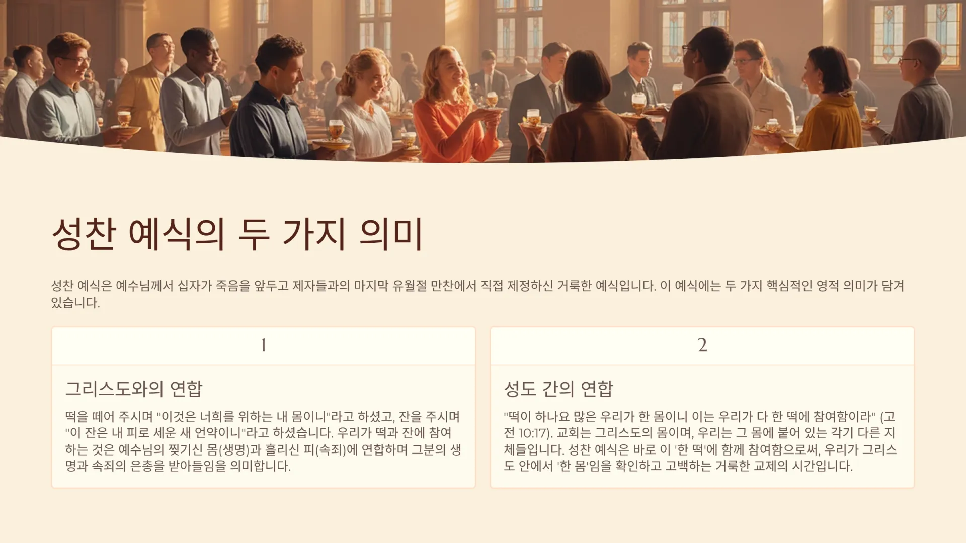 성찬 예식은 예수님께서 십자가 죽음을 앞두고 제자들과의 마지막 유월절 만찬에서 직접 제정하신 거룩한 예식이다(마 26:26-28). 이 예식에는 두 가지 핵심적인 영적 의미가 담겨 있다.