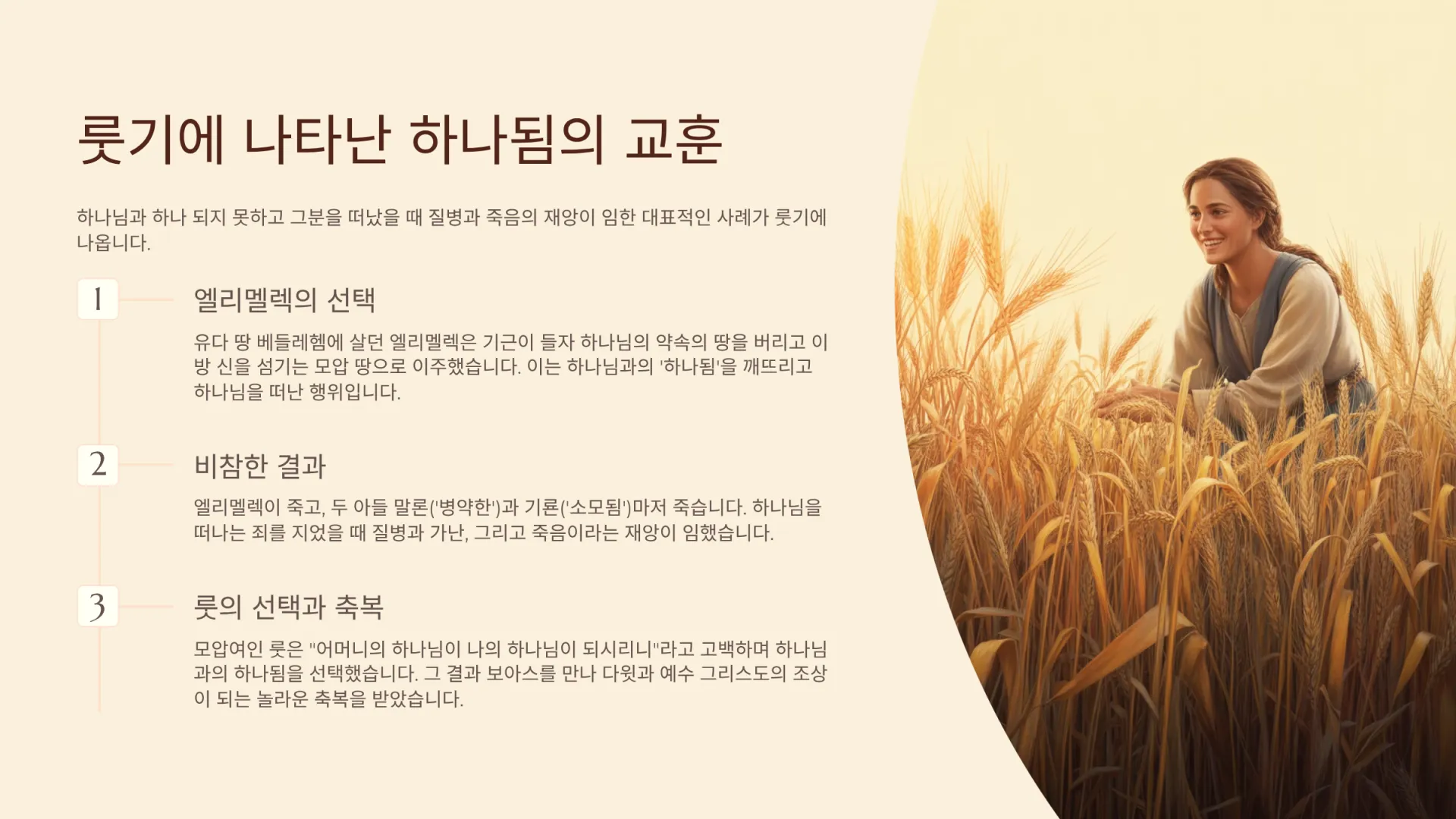 반대로 모압여인 며느리 룻은 “어머니의 하나님이 나의 하나님이 되시리니”(룻 1:16)라고 고백하면서, 하나님과의 하나될 것을 선택하고 베들레헴으로 시어머니의 뒤를 따라갔다. 그 결과 그는 보아스를 만나 오벳을 낳고, 다윗과 예수 그리스도의 조상이 되는 놀라운 축복을 받게 된다. 이처럼 하나님께 가까이 나아가 그분과 하나 될 때 우리는 치유와 생명을 얻지만, 그분을 떠나면 쇠약해지고 병들며 죽음에 이르게 된다.