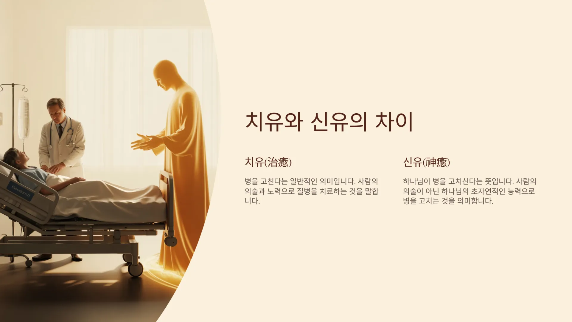 ‘치유(治癒)’라는 말은 병을 고친다는 일반적인 말이다. 그러나 ‘신유(神癒)’라는 말이 있다. 이것은 ‘하나님(神)이 병을 고치신다(癒)’는 뜻이다. 과거에는 신유 집회라는 말을 많이 썼는데, 이는 사람의 의술이 아닌 하나님의 초자연적인 능력으로 병을 고치는 것을 의미한다. 이번 시간에는 신유가 어떻게 일어나는지를 살펴보고자 한다.