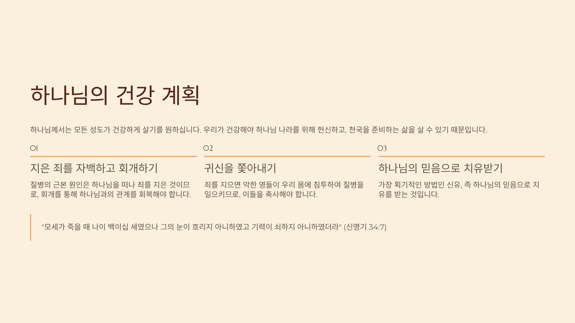 하나님께서는 모든 성도가 다 건강하게 살기를 원하신다. 우리가 건강해야 하나님 나라를 위해 헌신하고, 천국을 준비하는 삶을 살 수 있기 때문이다. 병들어 일찍 죽거나 고통 속에 살다가 죽는 것은 하나님의 뜻이 아니다. 모세가 120세에 죽을 때까지 눈이 흐리지 않고 기력이 쇠하지 않았던 것처럼(신 34:7), 우리도 하나님께서 주신 수명대로 건강하게 살다가 주님의 부르심을 받아야 한다. 그래서 사람이 어떻게 건강하게 사는지, 지난 시간까지 우리는 질병에서 낫는 2가지 방법을 살펴보았다. 그것은 첫째로, 지은 죄를 자백하고 회개하는 것이라고 했다. 질병의 근본 원인은 하나님을 떠나 죄를 지은 것이므로, 회개를 통해 하나님과의 관계를 회복해야 한다. 둘째로, 귀신을 쫓아내는 것이라고 했다. 죄를 지으면 악한 영들이 우리 몸에 침투하여 질병을 일으키므로, 이들을 축사(逐邪)해야 한다.