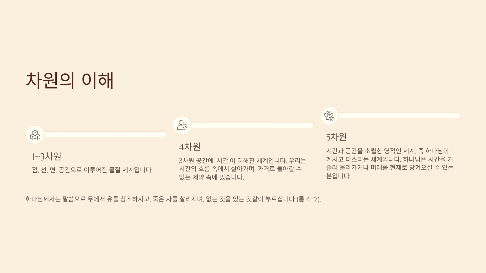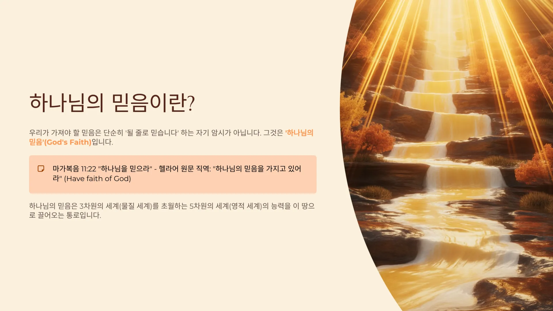 그렇다면 ‘하나님의 믿음’이란 대체 어떤 것인가? 그것은 3차원의 세계(우리가 사는 물질 세계)를 초월하는 5차원의 세계(영적 세계)의 능력을 이 땅으로 끌어오는 통로라고 할 수 있다. 이를 이해하기 위해서는 차원을 알아야 한다. 차원에는 1~3차원이 있다. 점, 선, 면, 공간으로 이루어진 물질 세계이다. 그리고 4차원이 있4다. 이는 3차원 공간에 ‘시간’이 더해진 세계이다. 우리는 시간의 흐름 속에서 살아가며, 과거로 돌아갈 수 없는 제약 속에 있다. 그리고 5차원이 있다. 이 세계는 시간과 공간을 초월한 영적인 세계, 즉 하나님이 계시고 다스리는 세계를 가리킨다. 하나님은 시간을 거슬러 올라가거나 미래를 현재로 당겨오실 수 있는 분이다. 그분은 시간과 공간 밖에 계시다가 창조를 통해 공간을 만드셨고 시간을 만드셨다.