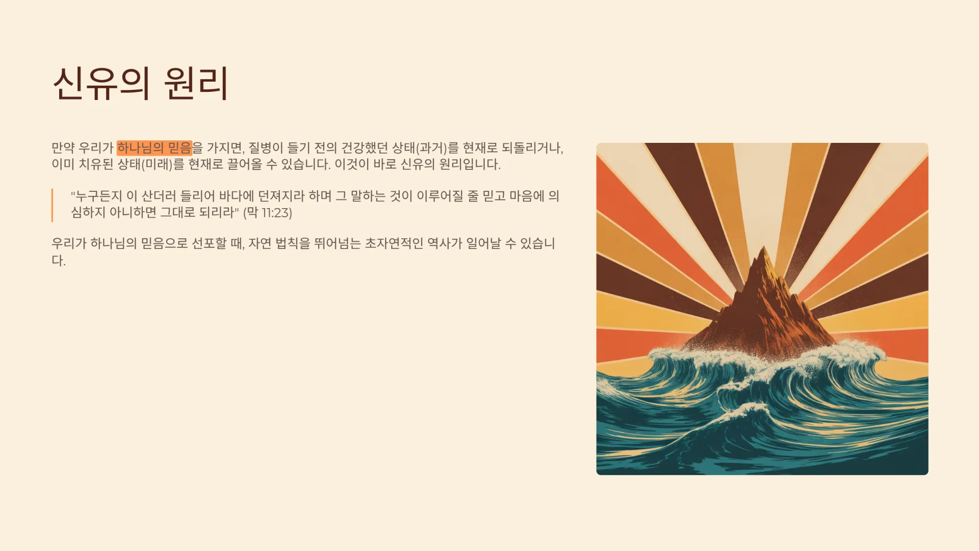 그때 하나님께서는 말씀으로 무에서 유를 창조하시고(빛이 있으라 하시매 빛이 있었고), 죽은 자를 살리시며, 지금도 없는 것을 있는 것같이 부르신다(롬 4:17). 그러므로 만약 우리가 이러한 ‘하나님의 믿음’을 가지면, 질병이 들기 전의 건강했던 상태(과거)를 현재로 되돌리거나, 이미 치유된 상태(미래)를 현재로 끌어올 수 있다. 이것이 바로 신유의 원리이다.