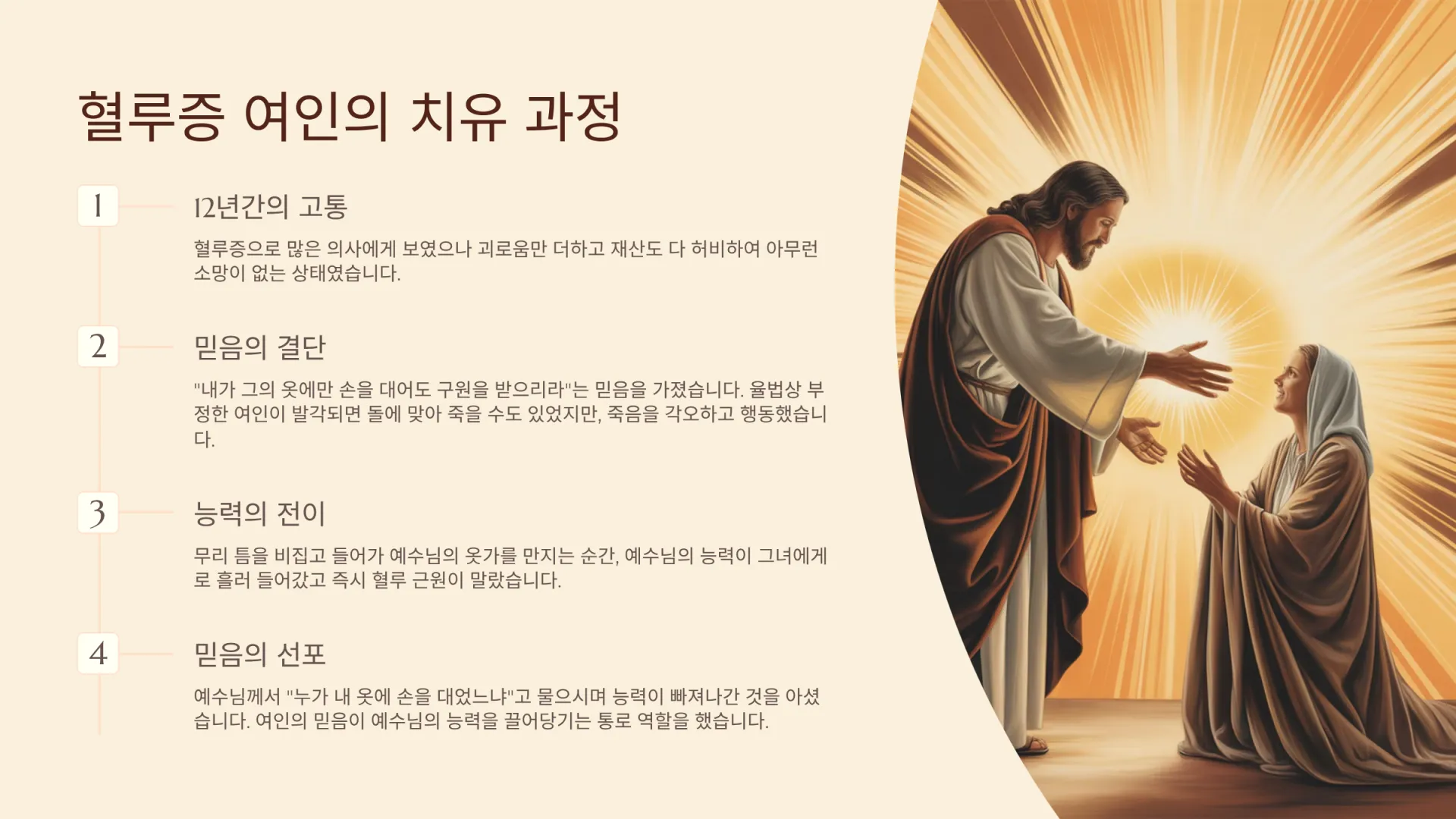 4. 12년 동안 혈루증을 앓던 여인은 어떤 믿음으로 치유를 받았는가?