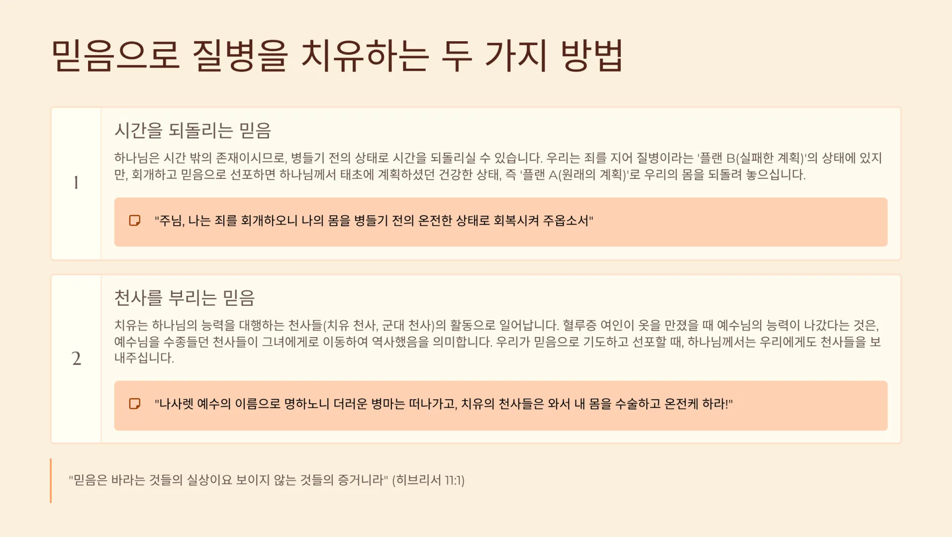 첫째, 시간을 되돌리는 믿음(플랜 A로의 회귀)을 사용하는 방법이 있다. 하나님은 시간 밖의 존재이시므로, 병들기 전의 상태로 시간을 되돌리실 수 있다. 우리는 죄를 지어 질병이라는 ‘플랜 B(실패한 계획)’의 상태에 있다. 그러나 회개하고 믿음으로 선포하면, 하나님께서 태초에 계획하셨던 건강한 상태, 즉 ‘플랜 A(원래의 계획)’로 우리의 몸을 되돌려 놓으신다. “주님, 나는 죄를 회개하오니 나의 몸을 병들기 전의 온전한 상태로 회복시켜 주옵소서”라고 믿고 기도하라.