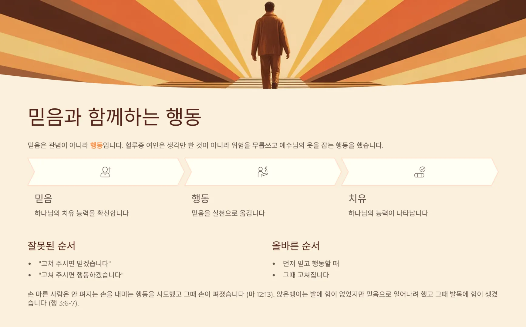 많은 사람이 “고쳐 주시면 믿겠습니다”, “고쳐 주시면 행동하겠습니다”라고 말한다. 그러나 순서가 틀렸다. 믿고 행동할 때 고쳐지는 것이다. 손 마른 사람에게 “손을 내밀라”고 하셨을 때, 그는 안 펴지는 손을 내미는 행동을 시도했고 그때 손이 펴졌다(마 12:13). 앉은뱅이에게 “일어나 걸으라”고 했을 때, 그는 발에 힘이 없었지만 믿음으로 일어나려 했고 그때 발목에 힘이 생겼다(행 3:6-7).