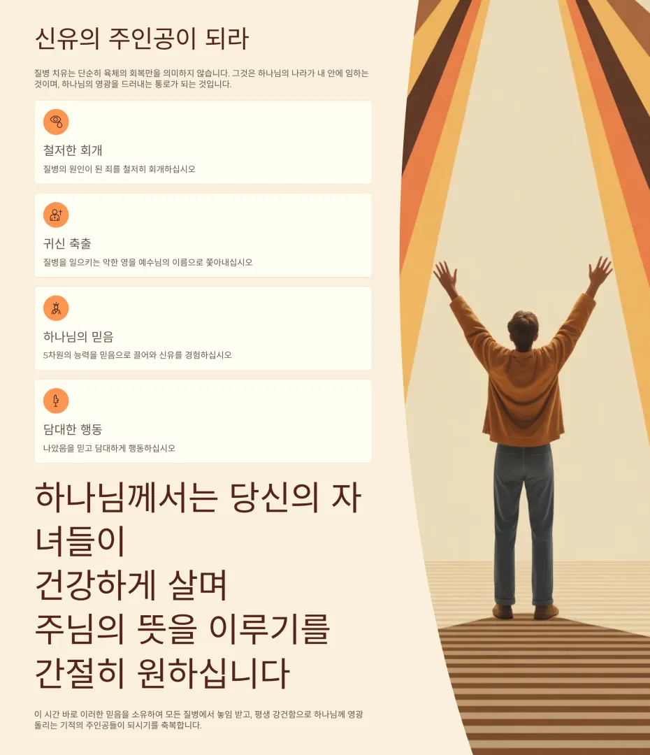 질병 치유는 단순히 육체의 회복만을 의미하지 않는다. 그것은 하나님의 나라가 내 안에 임하는 것이며, 하나님의 영광을 드러내는 통로가 되는 것이다. 우리는 질병 앞에서 무력하게 당하고 있어서는 안 된다. 첫째, 질병의 원인이 된 죄를 철저히 회개하라. 둘째, 질병을 일으키는 악한 영(귀신)을 예수님의 이름으로 쫓아내라. 셋째, 이제는 ‘하나님의 믿음’을 가지고 신유(神癒)를 경험하라. 나의 이성과 경험을 뛰어넘는 5차원의 능력, 하나님의 능력을 믿음으로 끌어와라. 병들기 전의 건강한 모습으로 회복됨을 믿고 선포하라. 그리고 나았음을 믿고 담대하게 행동하라. 하나님께서는 당신의 자녀들이 건강하게 살며 주님의 뜻을 이루기를 간절히 원하신다. 이 시간도 바로 이러한 믿음을 소유하여 모든 질병에서 놓임 받고, 평생 강건함으로 하나님께 영광 돌리는 기적의 주인공들이 되기를 바란다.