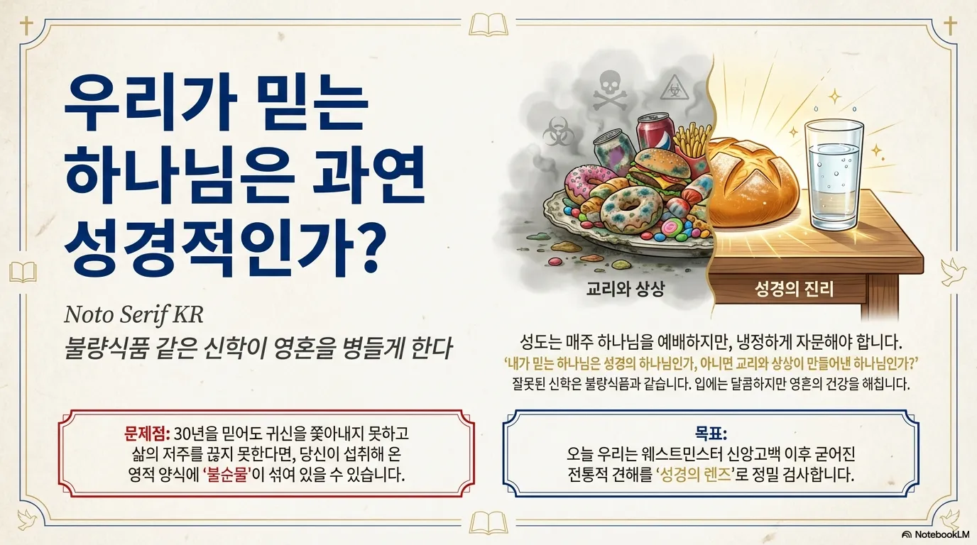 오늘날 성도들은 매주 교회에 나와서 하나님을 예배한다. 그런데 냉정하게 자문해 볼 질문이 있다. 내가 믿고 있는 하나님은 과연 성경이 말씀하고 있는 바로 그 하나님인가, 아니면 교리나 전통, 혹은 내 상상이 만들어낸 하나님인가? 우리가 먹는 음식 중에는 몸에 해로운 불량식품이 있다. 입에는 달콤하지만 건강을 해치고 만다. 영적인 양식도 마찬가지다. 우리가 지금까지 들어왔던 설교나 신학적 지식 중에 불순물이 섞인 '불량품'이 있다면 어떻게 하겠는가? 그것을 계속 먹으면 영혼이 병들고 능력이 나타나지 않는다. 30년을 믿어도 귀신 하나 쫓아내지 못하고, 삶의 저주를 끊지 못하는 이유가 바로 여기에 있는 것이다.