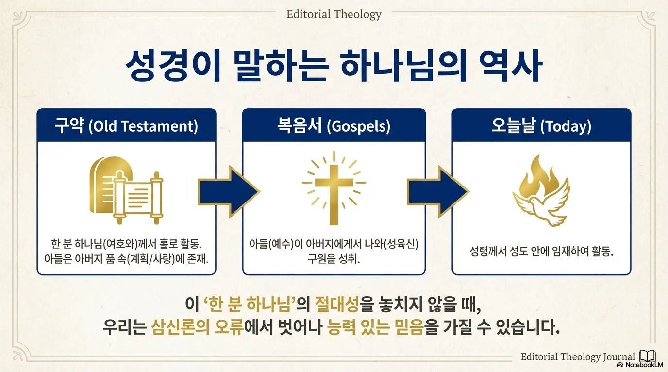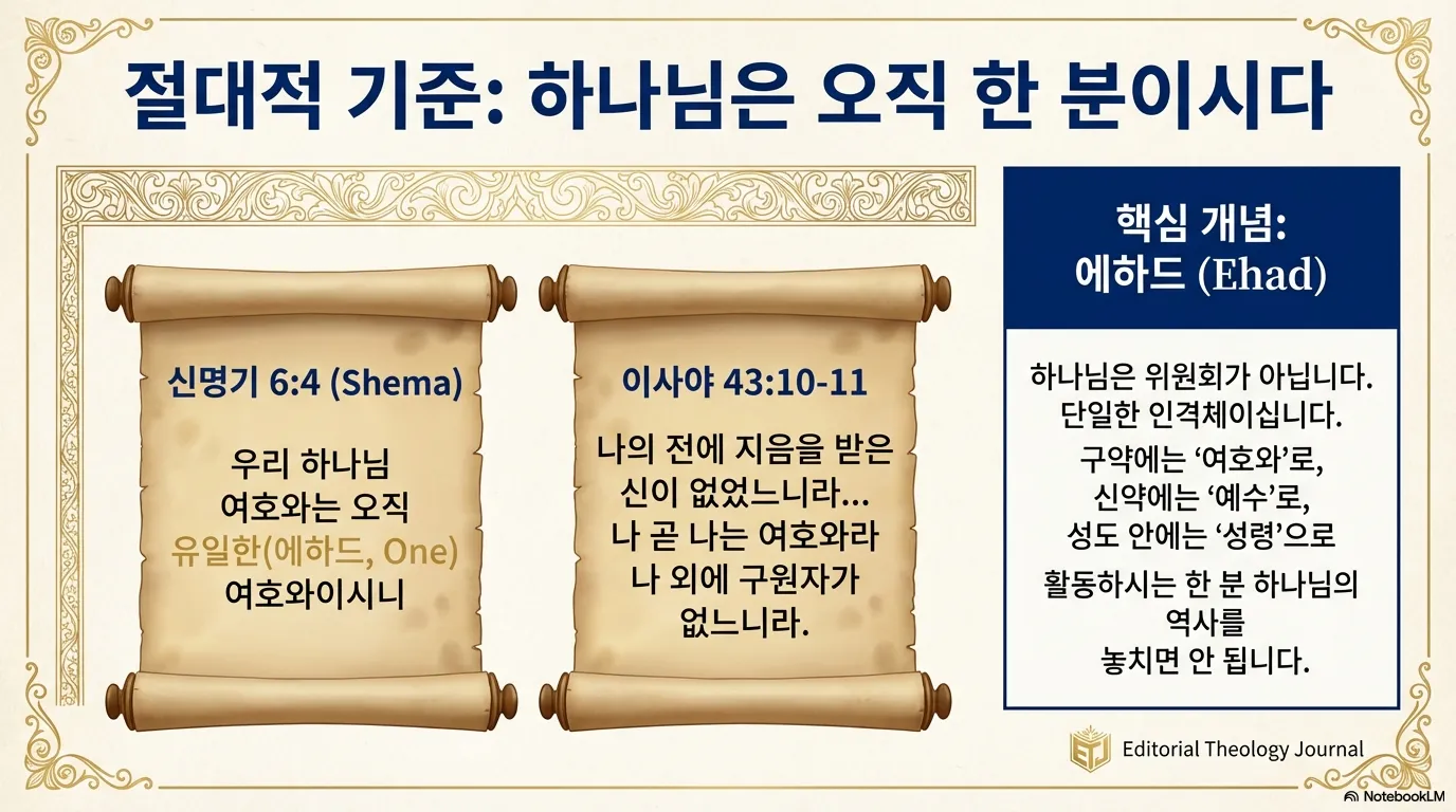 기독교 신앙의 가장 기초는 '유일신(Monotheism)' 사상이다. 신명기 6장 4절은 이스라엘의 신앙 고백인 '쉐마'를 선포한다. "이스라엘아 들으라 우리 하나님 여호와는 오직 유일한(하나인) 여호와이시니." 여기서 '유일한'은 히브리어로 '에하드', 즉 '하나(One)'라는 뜻이다. 하나님은 여럿이 아니라 한 분이시다.